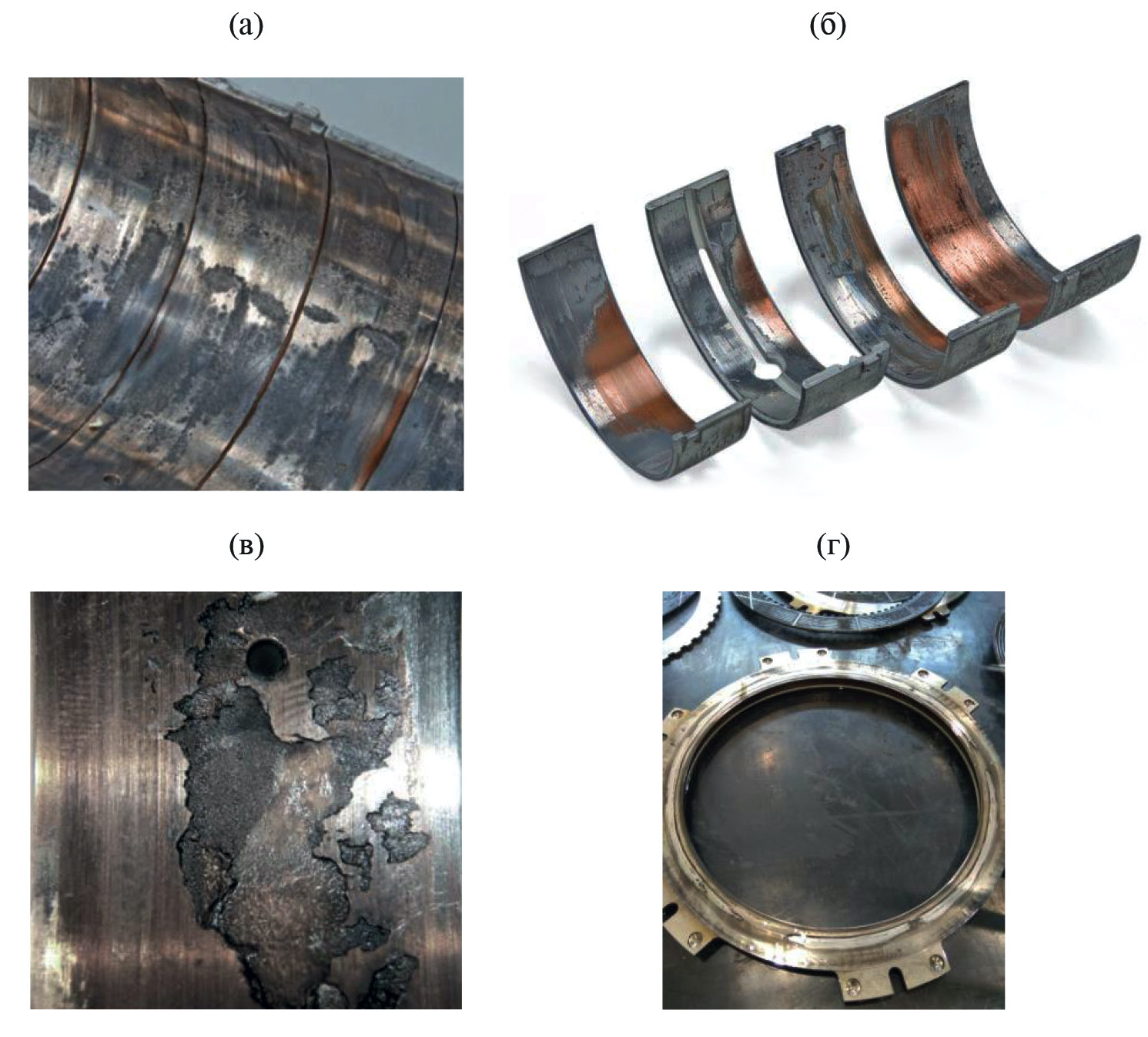 Рис. 1. Виды повреждений. Изношенные поверхности подшипников скольжения двигателя: (а) – рабочая изношенная поверхность; (б) – неравномерный износ; (в) – поврежденная рабочая поверхность подшипника скольжения; (г) – перегретые и изношенные диски пакетов автоматической коробки передач карьерных самосвалов