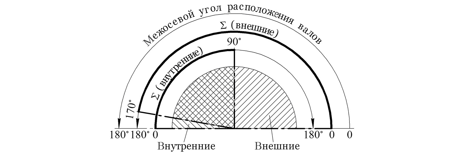 Согласно рис. 1 и ГОСТ 19624–74 внешнее коническое зацепление существует в диапазоне межосевых углов 0–170°. При этом, начиная от 120° и выше, диапазон передаточных чисел такой передачи сокращается до 1.0–1.25 ввиду некоторых математических свойств эвольвенты, что делает из нее не редуктор, а передаточный механизм. Внутреннее коническое зацепление позволит решить такой недостаток, поскольку его ориентировочному рабочему диапазону 0–90°, отсчитываемому с диаметрально противоположной стороны, соответствуют углы расположения валов от 180° до 90°. Кроме того, такие передачи по аналогии с внутренними цилиндрическими передачами обладают лучшими качественными показателями. Диапазоны возможных передаточных чисел внутреннего конического зацепления являются достаточно широкими.