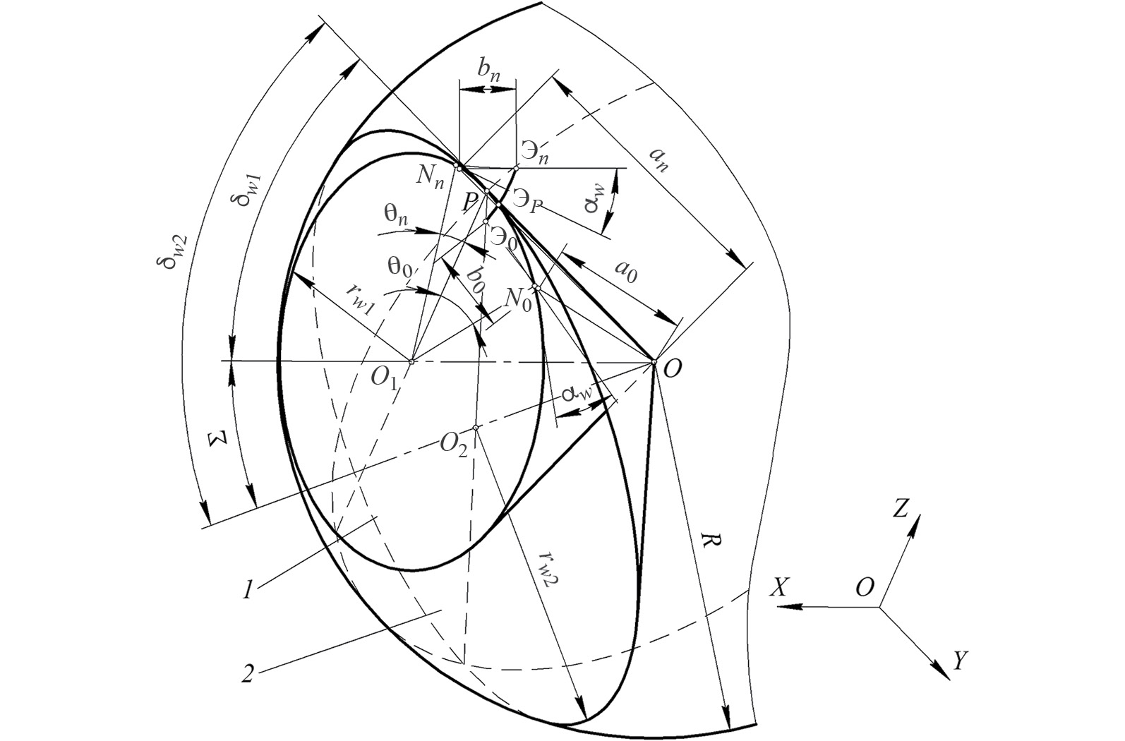 где и – отрезки, указывающие точки эвольвенты на рис. 3 (a0 и b0 – на крайнюю нижнюю точку, an и bn – на крайнюю верхнюю точку); – угол между плоскостями, проходящими через ось Х (прямую OO1) и точки P и Ni соответственно (здесь yN и zN – координаты точки Ni в системе OXYZ; αSw – толщина зуба шестерни 1 при профилировании эвольвенты как шестерни 1, так и колеса 2, поскольку толщина впадины между зубьями на колесе равна толщине зуба шестерни).