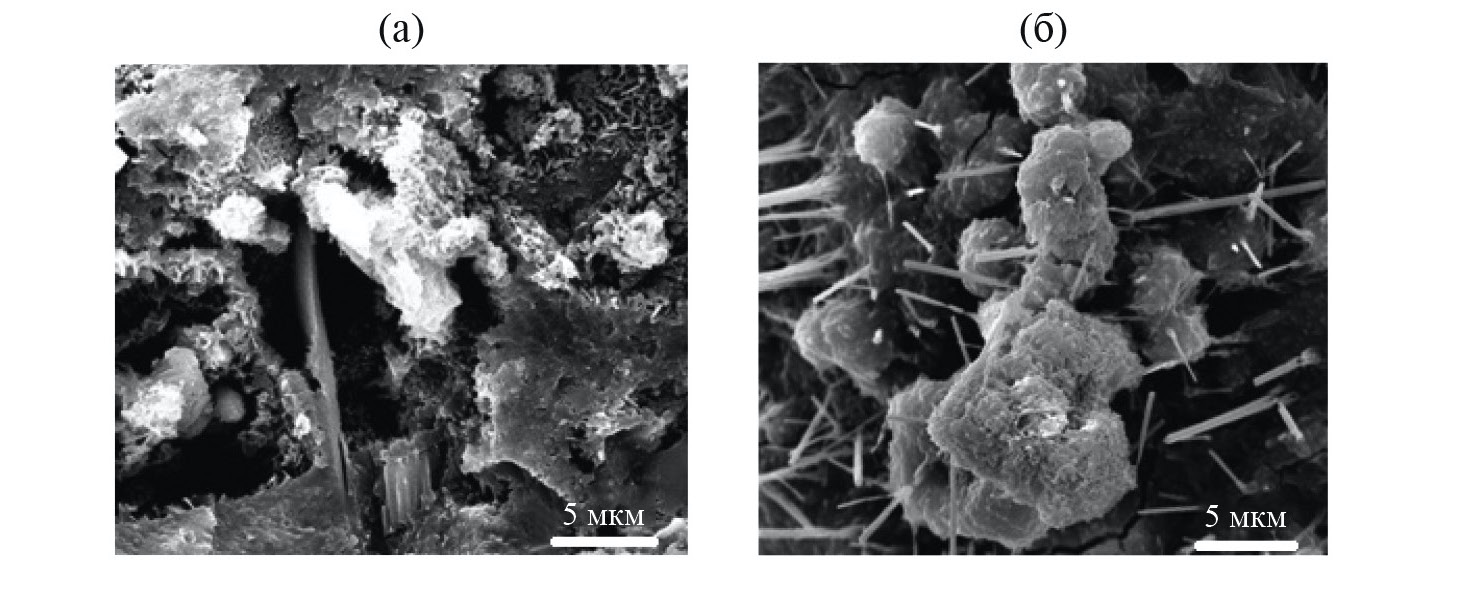 Рис. 2. Микроструктура цементного камня: (а) – до волновой обработки; (б) – после волновой обработки