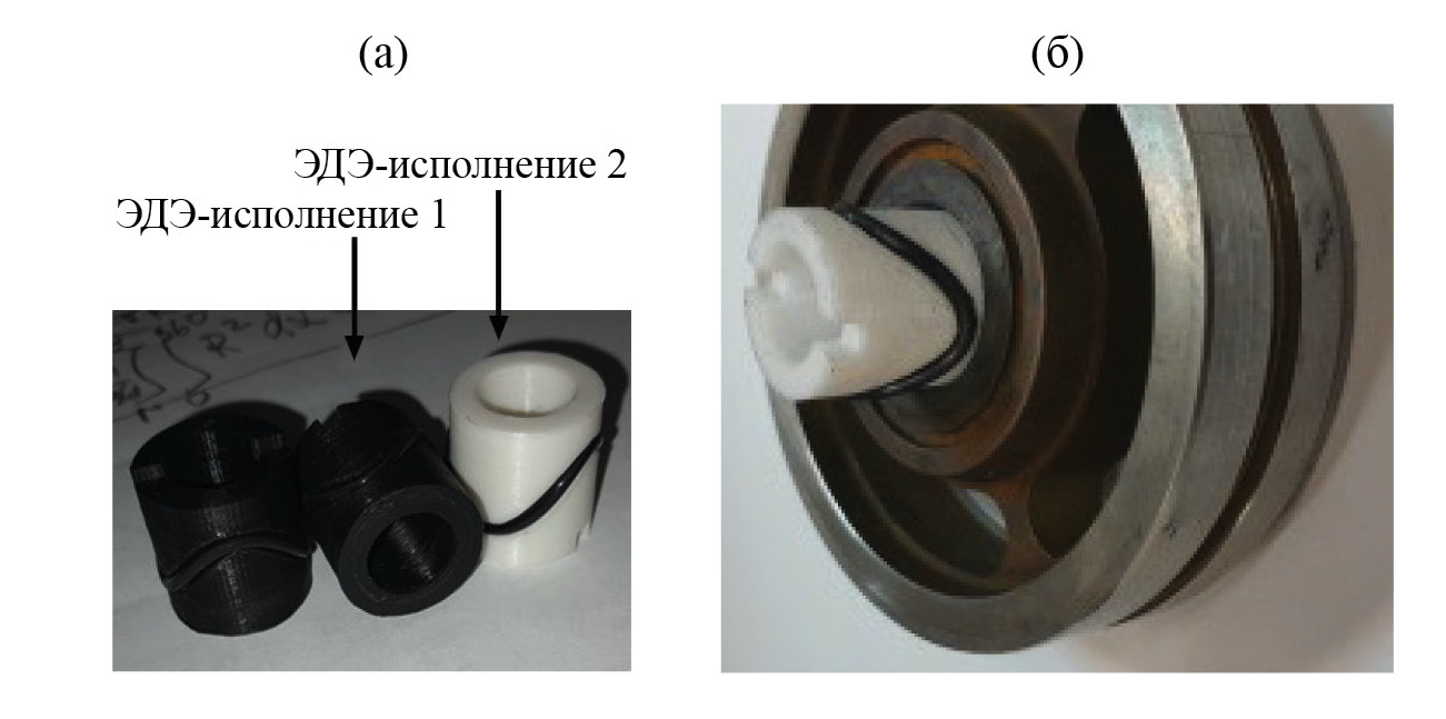 Рис. 3. Защитные втулки с эластичным демпфирующим элементом – ЭДЭ радиального подшипника узла осевой разгрузки ротора ЛВН 01-92: (а) – втулки с исполнением 1 и 2; (б) – вид установки втулки в подшипник
