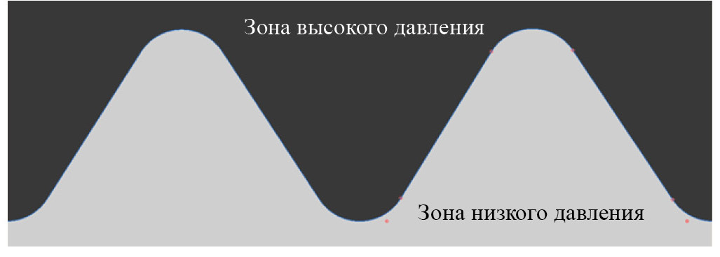 Так как у данного типа подшипника минимизирован или отсутствует переток жидкости, в связи с этим образуются 2 зоны высокого и низкого давления, что показано на развертке (рис. 4).