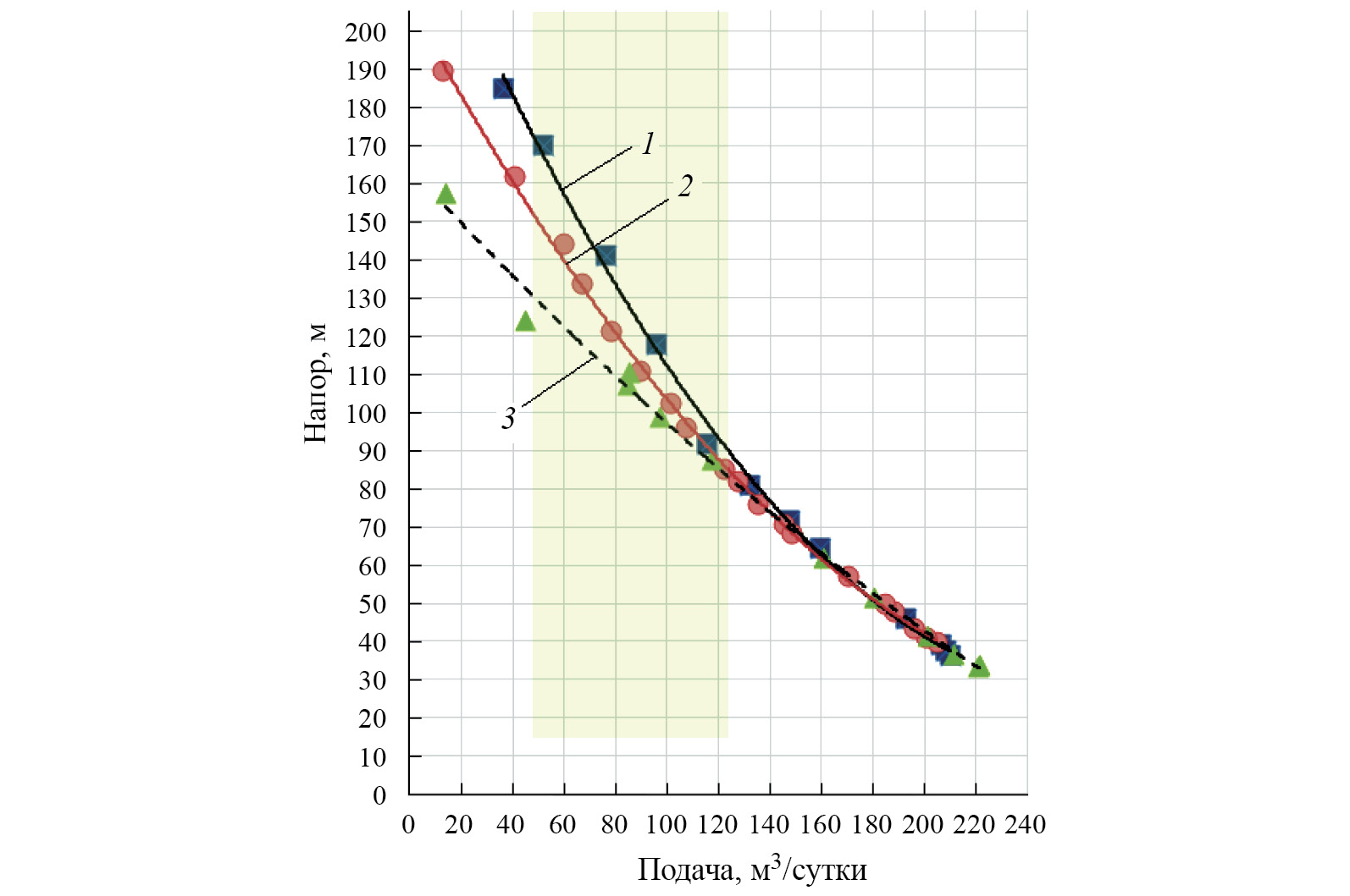 Рис. 6. Уровень напора ЛВН 01-92 в зависимости от типа радиального подшипника узла разгрузки: 1 – ЭДЭ; 2 – подшипник без канавки; 3 – подшипник с канавкой