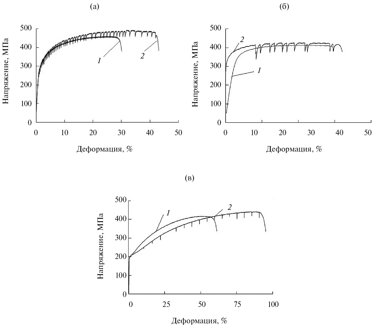 Экспериментальные результаты и обсуждение. На рис. 2 представлены кривые растяжения “напряжение–деформация” образцов технически чистого титана ВТ1-0 и ВТ1-00, отличающихся содержанием примесных элементов (рис. 2а, б) и монокристаллического алюминия (рис. 2в) без тока кривые 1 и с током в форме одиночных импульсов кривые 2.