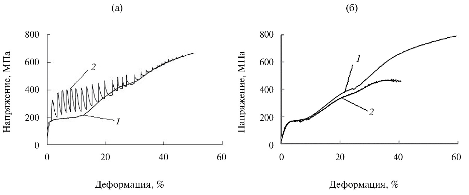 Рис. 3. Кривые напряжение-деформация при растяжении без тока 1 и с током 2: (а) – Ti49.3Ni50.7, j = 500A/мм², τ = 100 мкс (Q = 140000); (б) – Ti50Ni50, j = 500–1500A/мм², τ = 1000 мкс.