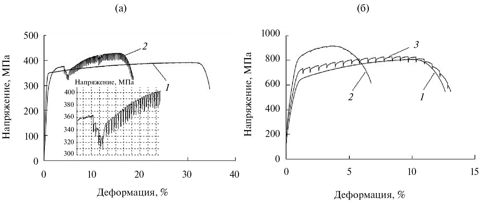 Рис. 4. Кривые напряжение-деформация при растяжении сталей Ст3 (а) и Х18Н10Т (б): 1 – без тока; 2, 3 – с током; (а) – Ст3 кривая 2: j = 115 А/мм², τ = 1с, температура ≤50°C, Q = 300000; (б) – Х18Н10Т, кривая 2: j = 820 А/мм², τ = 250 мкс; кривая 3: j = 2600 А/мм² τ = 1000мкс, 54°C, Q = 100000. Во вкладке к рис. 4а – участок растяжения при увеличенном масштабе.