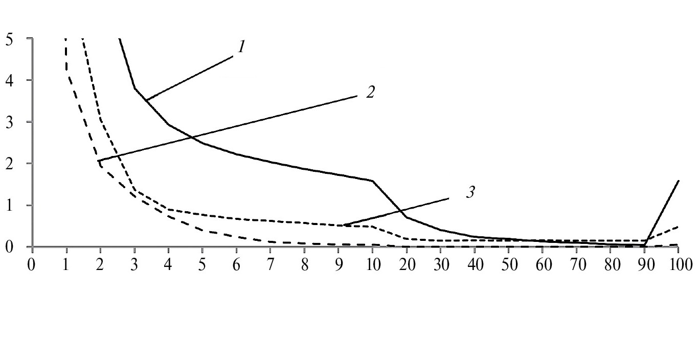 Рис. 6. Сравнительные результаты для ИС 140UD26A с другим коэффициентом k сокращения оценки усадки Джеймса–Штейна на стандартное отклонение значения целевой функции: 1 – нормализация по стандартному отклонению; 2 – нормализация по значениям допустимого дрейфа; 3 – по допустимым значениям параметров.