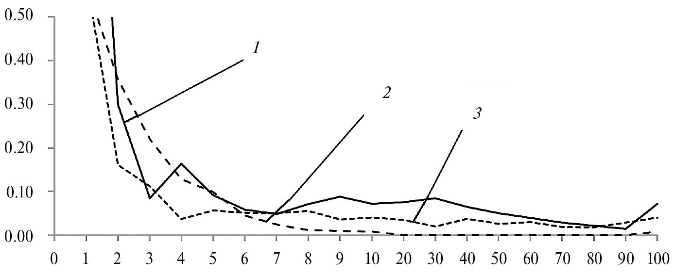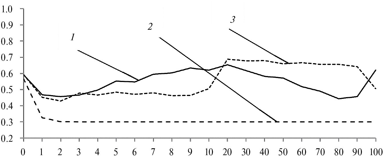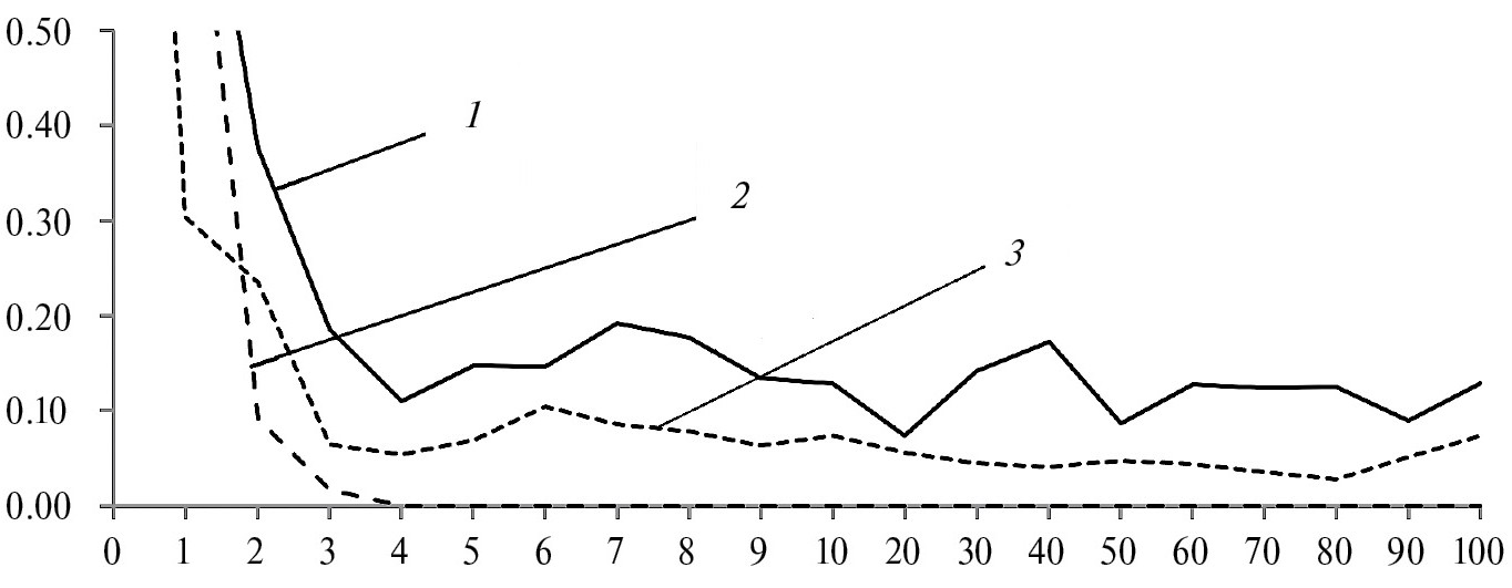 Рис. 3. Сравнительные результаты для ИС 140UD25A с другим коэффициентом k сокращения оценки усадки Джеймса–Штейна по индексу Rand: 1 – нормализация по стандартному отклонению; 2 – нормализация по значениям допустимого дрейфа; 3 – по допустимым значениям параметров.