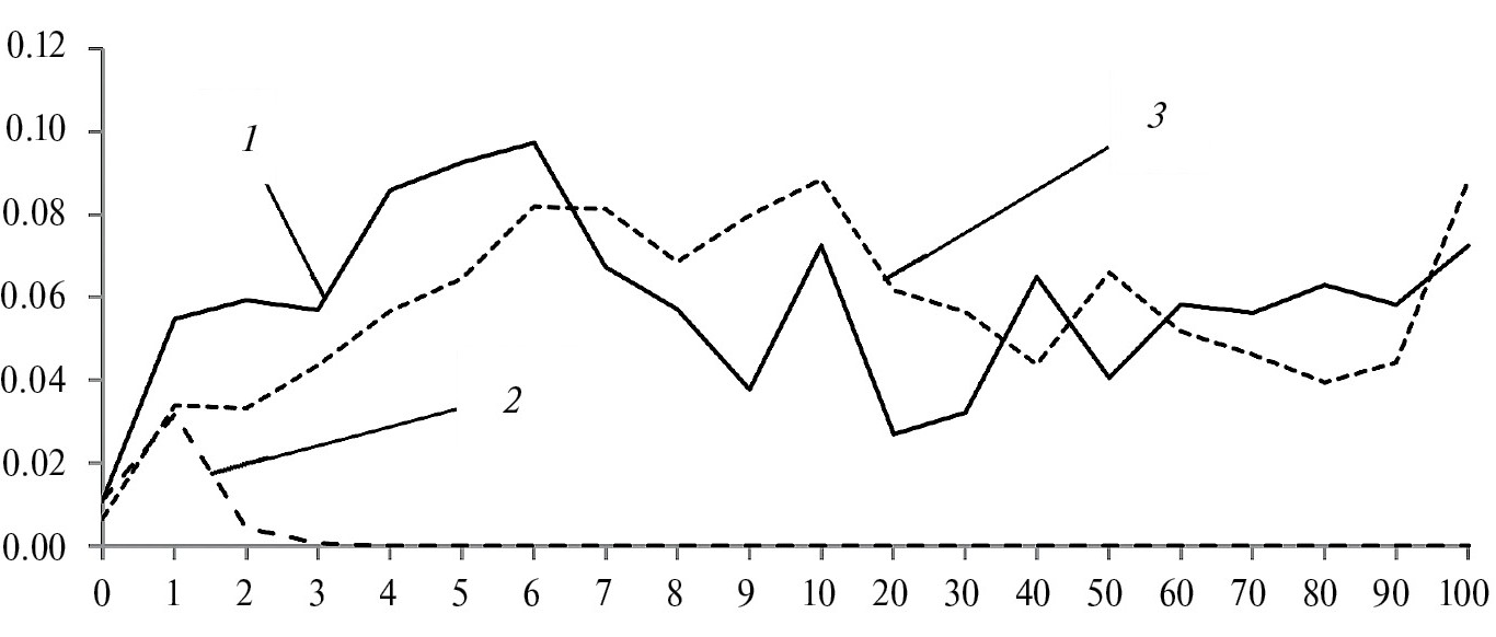 Таким образом, сформировано 24 набора данных, для каждого из которых проведено по 30 экспериментов с использованием алгоритма кластеризации k-средних с евклидовыми мерами расстояния. При этом исследовали влияние коэффициента k = (0, …, 100) сокращения оценки усадки Джеймса–Штейна к некоторому значимому ненулевому значению.