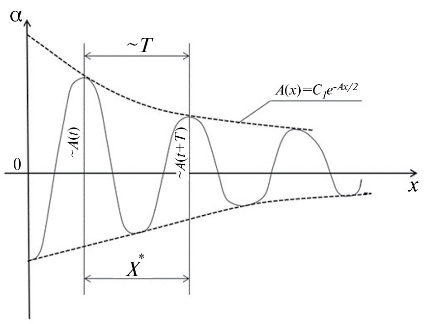 Перейдя в выражении (5) от времени t к расстоянию х, определим степень затухания колебаний элемента