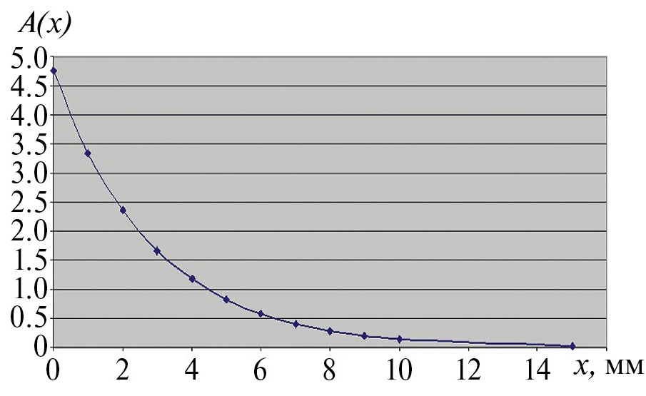 Рис. 4. Расчетная зависимость огибающей A(x) амплитуды колебаний элемента от расстояния.
