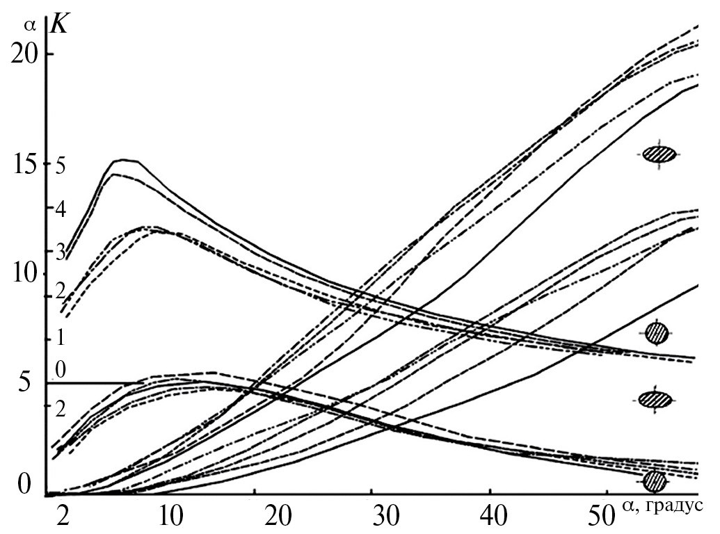 Рис. 5. График влияния формы поперечного сечения на аэродинамические характеристики тела большого удлинения при числе маха М > 2 и числах Рейнольдса Red = 380000 [2].