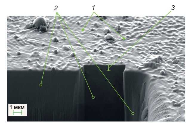 Рис. 1. Общий вид стального образца с ионно-плазменным покрытием CrTiZrNbHf в электронном микроскопе: 1 — поверхность покрытия (наклон образца в сторону наблюдателя 26 град); 2 — поверхности кросс-секции, вырезанной в образце ионным пучком (FIB); 3 — поперечное сечение покрытия толщиной h ≈ 0.8 мкм.