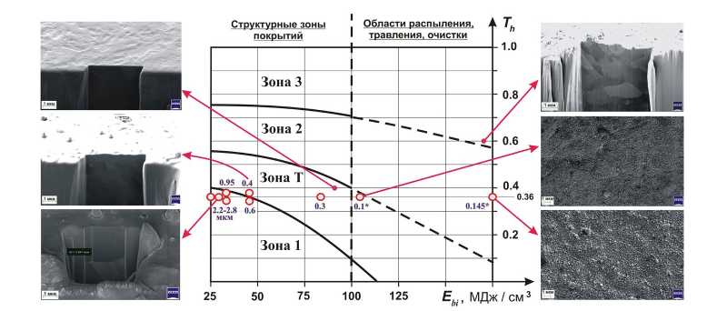 Таким образом, анализ кинетики осаждения покрытия ВЭС системы CrTiZrNbHf с точки зрения процесса формирования особенностей его структуры позволяет использовать диаграмму М–Д–Т для выбора значений технологических параметров, обеспечивающих получение оптимальной структуры покрытия ВЭС. Комплекс таких технологических параметров, как температура подложки, давление в вакуумной камере, скорость осаждения покрытия, плотность ионного тока, напряжение смещения и др. объединяется в виде интегрального параметра, называемого энергией осаждения Ebi. Параметр Ebi определяется расчетным путем и, наряду с гомологической температурой Th, образует оси зонной структурной плоскости на диаграмме М–Д–Т. Путем варьирования технологических параметров, которые объединяются энергетическим параметром Ebi, необходимую структуру ионно-вакуумного покрытия ВЭС можно корректно задать (спрогнозировать) с помощью диаграммы М–Д–Т в осях Th–Ebi.
