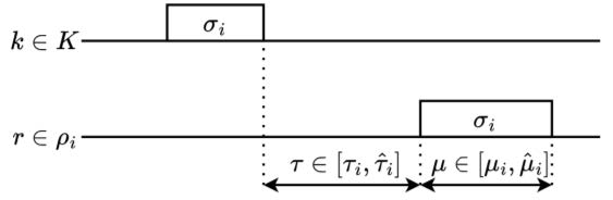 Пусть заданы множество требований S = {s1, …, sn} и множество машин Для каждого требования определим ρi ⊆ R как подмножество машин, доступных для размещения σi. С прикладной точки зрения подмножество машин ρi определяется технологическими характеристиками требования σi. Пусть для каждого σi определены также ti, – минимально необходимое и максимально допустимое время ожидания с момента подготовки на специализированном агрегате из множества K = {k1, …, kl}. Допустимые минимальную и максимальную длительности обработки σi на машине из подмножества ρi обозначим соответственно через (рис. 1).