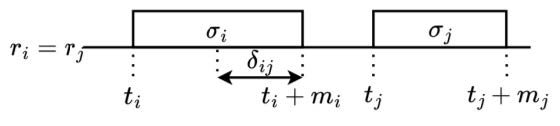 Замечание 1. В расширенной постановке задача (2) может включать также и ограничения на длительность δij подготовки машины ri = rj при последовательном назначении требований f (si), f (sj) (рис. 2). Авторы не рассматривают данную группу ограничений ввиду декомпозиции множества в предположении, что длительность подготовки постоянна для требований с идентичными технологическими характеристиками и включена в интервал [ti, ti + mi] для любых f (σi), f (σj), где ri = rj и ti ≤ tj.