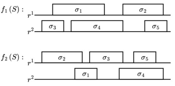 где , если требование σi выполняется на машине ri с началом в момент времени ti и продолжительностью mi, с ограничениями: