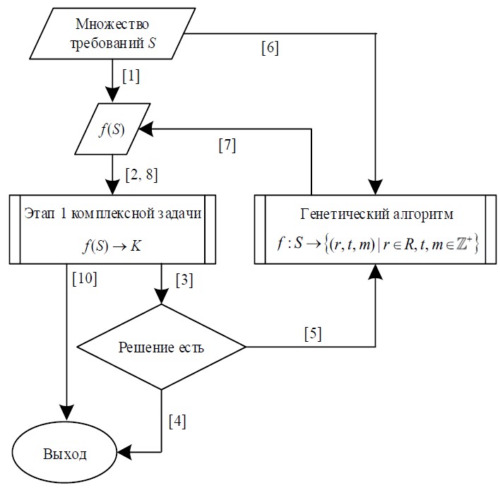 К современным инструментам решения задач среднесрочного планирования производственных процессов относят системы класса APS (Advanced Planning and Scheduling). Среди популярных отечественных систем данного класса можно выделить такие, как AVM.APS, BFG APS, БИА.APS и Аскон Гольфстрим. Из зарубежных разработок класса APS широкое распространение получила Tecnomatix Plant Simulation. Основными методами решения задач оптимизации в данных системах выступают алгоритмы имитационного моделирования и машинного обучения [2–4]. В настоящей статье для решения рассматриваемой комплексной задачи планирования используется система, в основе которой лежат подходы математического программирования [5]. Рассматриваемая комплексная задача планирования производственных процессов потокового типа включает два этапа. На первом этапе для фиксированного по времени и машинам множества требований (работ) формируется график их обработки на основных подготовительных агрегатах. На следующем этапе для фиксированных по времени, машинам и подготовительным агрегатам требований формируется детализированный технологический маршрут. Такой декомпозированный подход обусловлен практическими аспектами рассматриваемого типа производства и, кроме того, позволяет существенно снизить размерности оптимизационных задач, возникающих на каждом этапе. Однако часто уже на первом этапе решения комплексной задачи (назначение подготовительных агрегатов) возникающие оптимизационные модели оказываются несовместными. Природа такой несовместности во многом обусловлена исходным размещением требований по машинам и фиксированным временем начала и длительности их обработки. В этой связи в настоящей статье предлагается рассмотрение вспомогательного этапа размещения требований в целях обеспечения последующей гарантированной разрешимости этапов назначения подготовительных агрегатов и формирования детализированных технологических маршрутов. Для решения задачи размещения требований предлагается генетический алгоритм, реализуемый в качестве автономного модуля системы планирования [5].