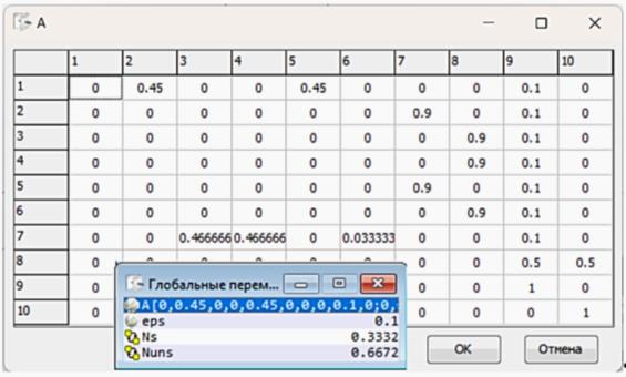Строки матрицы соответствуют следующим состояниям: S1 – начальное состояние, где случайным образом осуществляется выбор атаки через КПП (S2) или нескольких вариантов преодоления стены (S3, S4, S5); S6, S7 – вспомогательные состояния, позволяющие сократить число путей в S8 (захват охраной агента) и S9 (достижение агентом цели (проигрыш защиты)).