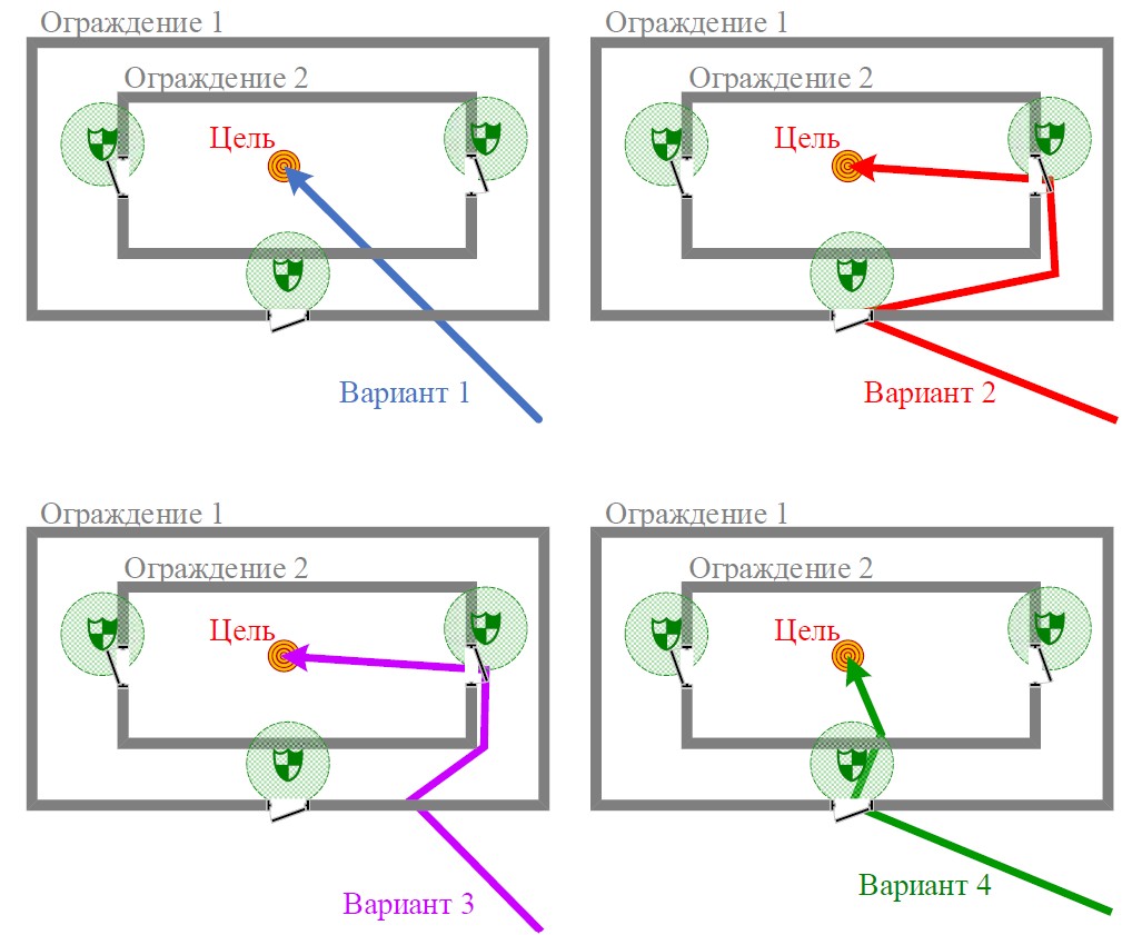 Аналогично моделируется реакция охранника, который, как и в реальной жизни, должен вовремя отреагировать на нарушение и приблизиться к атакующему агенту. Успешная защита объекта возможна только в случае, если время движения охранника к нарушителю (TОхр) меньше времени движения агента (TНар) до цели [11].