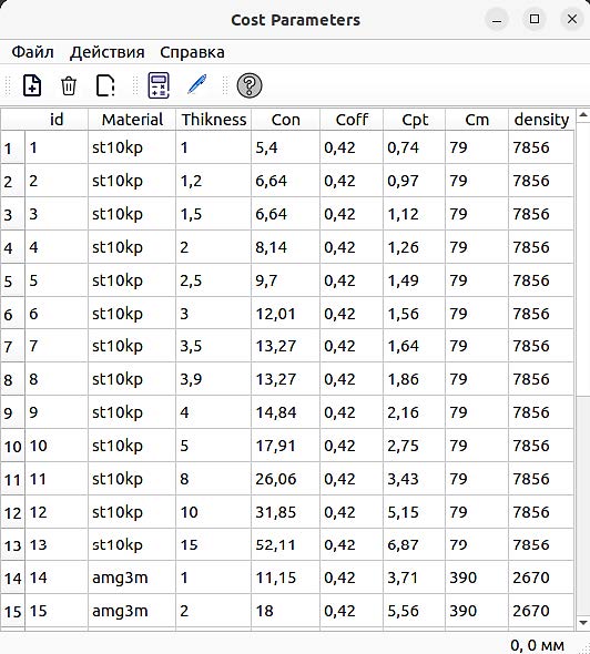 cut_cost – стоимость единицы пути режущего инструмента на рабочем ходу value_cut_cost для марок материалов и соответствующих толщин из таблиц material и thikness (соответственно material_id, thikness_id);