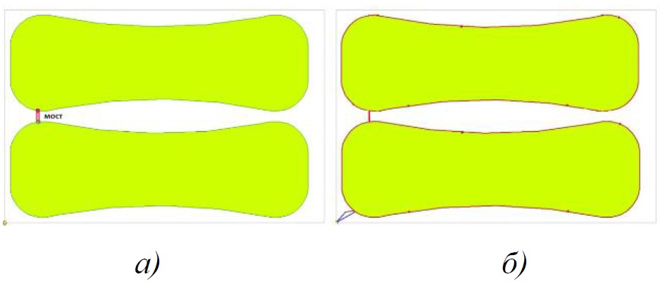 На рисунке 4 показаны вариант вырезки деталей для раскроя (рис. 3) с применением техники резки «мост», а также маршрут резки. Детали вырезаются с одной точкой врезки, без выключения режущего инструмента при переходе от первой детали ко второй за счет наличия «моста». Для данного примера длина рабочих перемещений режущего инструмента Lon = 1383 + 20 = 1403 мм (длина «моста» 10 мм в каждую сторону), количество точек врезки Npt = 1, соответственно стоимость процесса резки Ccut = 303.18 руб.