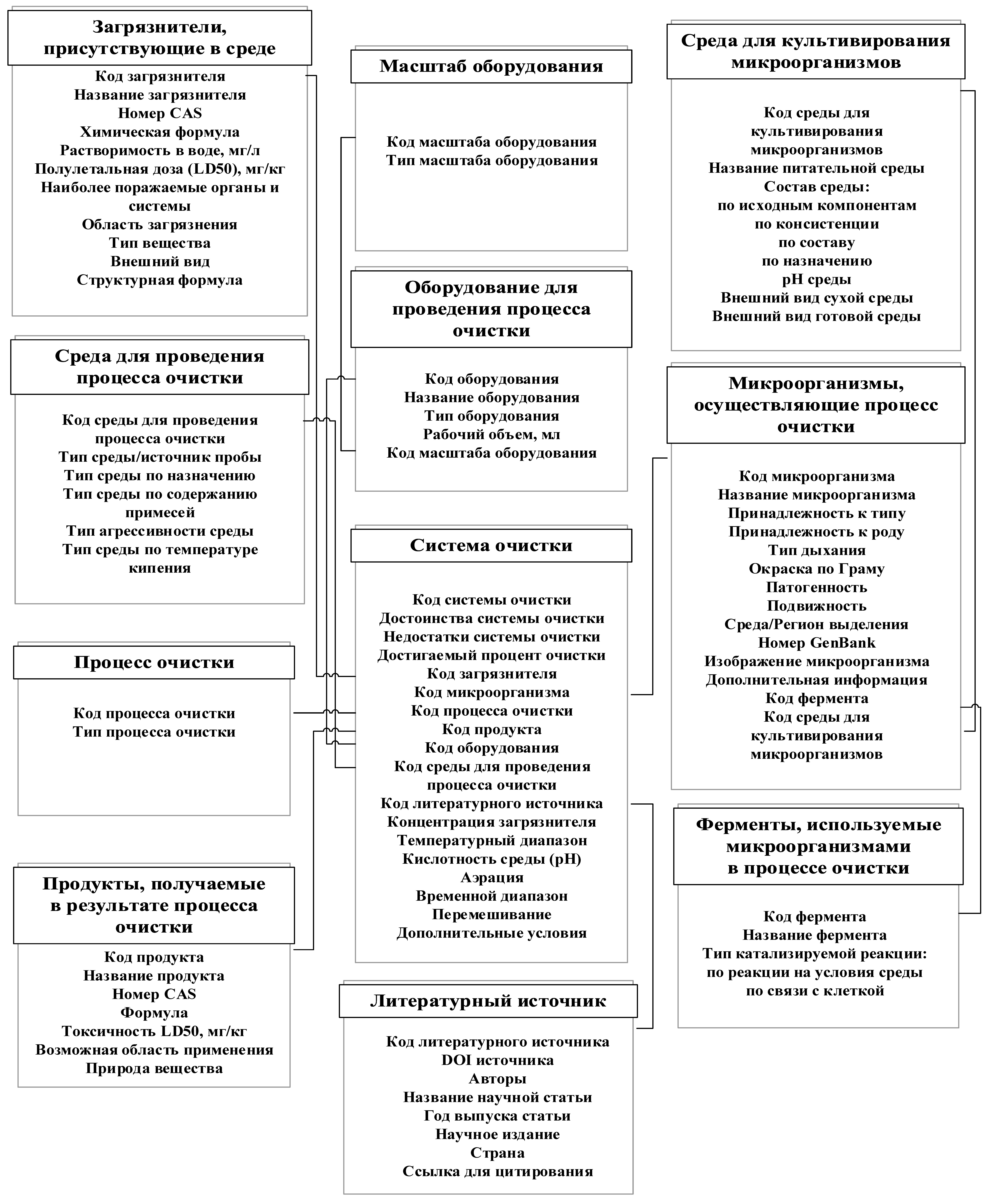 Помимо выделения сущностей процесса микробиологической очистки, были установлены уникальные элементы – атрибуты, наиболее целостно характеризующие каждую сущность и способствующие наиболее быстрому пониманию процесса очистки как единой функционирующей системы [12]. Также были определены связи между всеми элементами – построена архитектура БД (рис. 1).