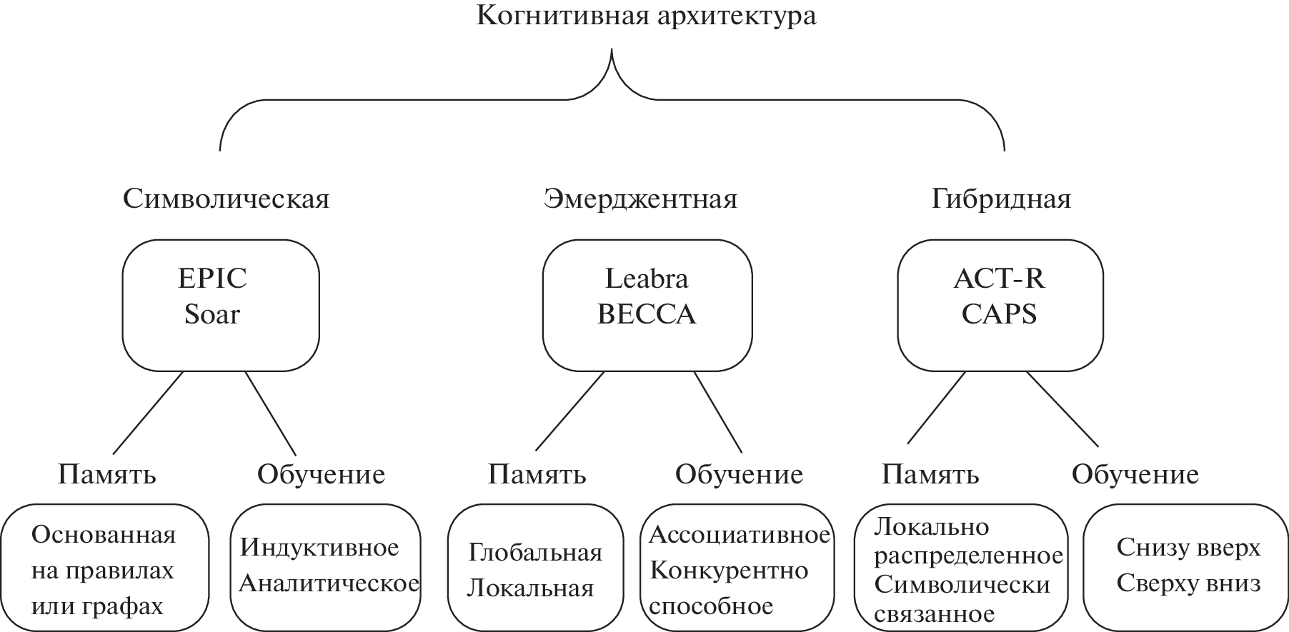 Описаны основные подходы к моделированию познавательной деятельности человека и нейронных механизмов, лежащих в ее основе. Приведена систематизация когнитивных архитектур и дан обзор таких популярных моделей как ACT-R, SOAR, CLARION и CHREST с примерами их практического применения в психологии и нейрофизиологии. Разработанные модели когнитивных функций позволяют давать прогнозы эффективности восприятия и селекции информации, какие знания и процедуры требуются для оптимального решения задачи, ожидаемую частоту ошибок при выполнении задания и какая функциональная система мозга используется для организации поведения. Совершенствование и дополнение существующих моделей когнитивной архитектуры рассматривается как перспектива развития когнитивной нейронауки, понимания закономерностей формирования естественного интеллекта и разработки искусственного интеллекта.