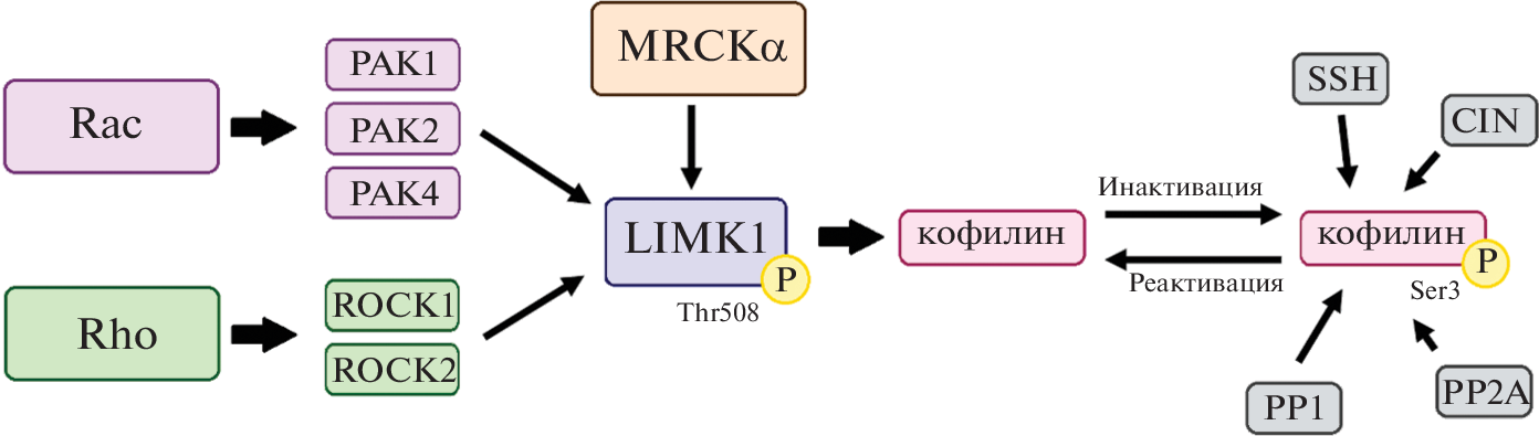 - Yang N., Higuchi O., Ohashi K. et al. Cofilin phosphorylation by LIM-kinase 1 and its role in Rac-mediated actin reorganization // Nature. 1998. V. 393. № 6687. P. 809. https://doi.org/10.1038/31735