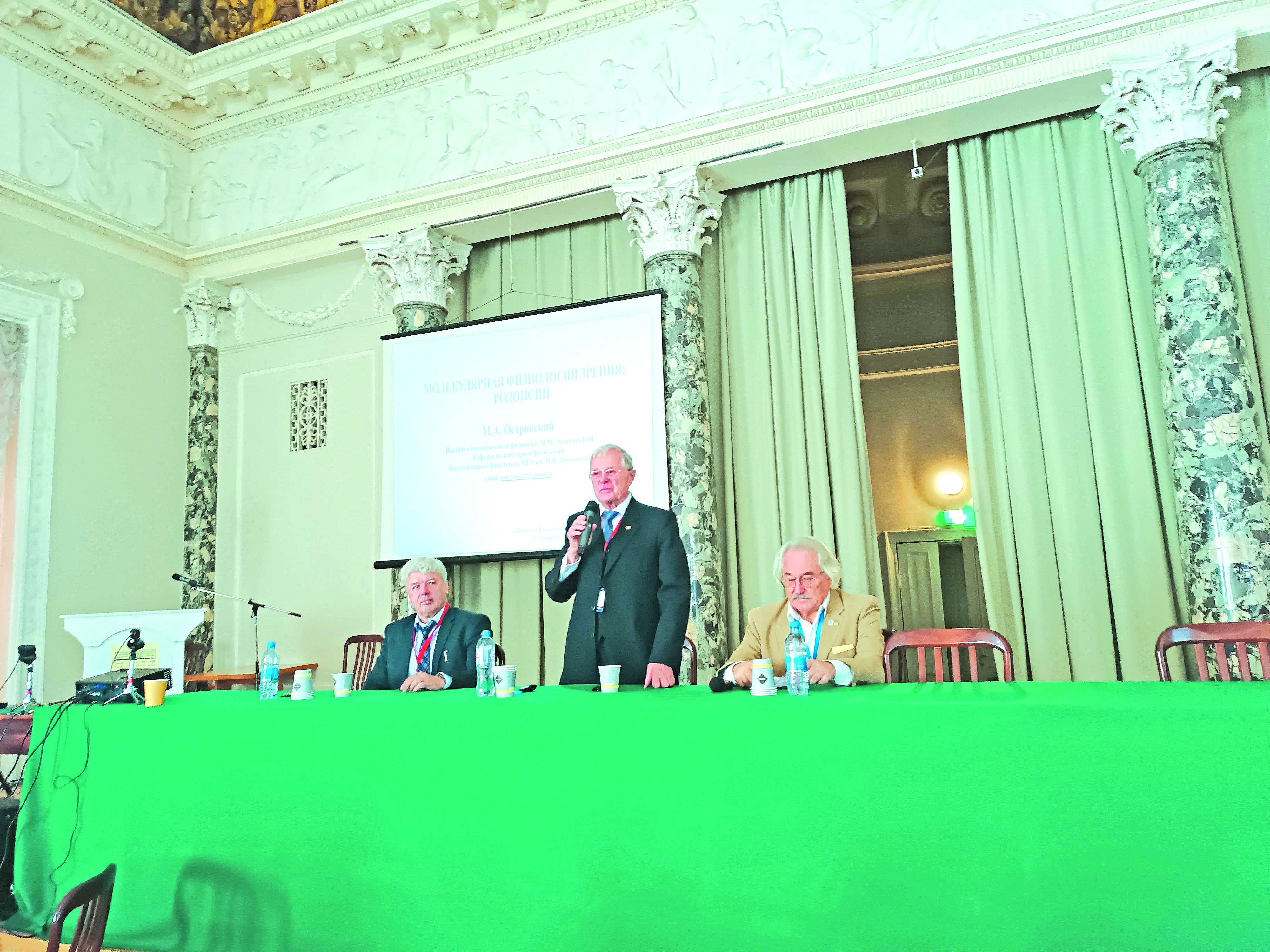 Отличительной особенностью научной программы XXIV съезда Физиологического общества им. И.П. Павлова были специально подготовленные пленарные лекции. Все лекторы откликнулись на просьбу организаторов подготовить эти лекции таким образом, чтобы они широко охватывали ту область физиологической науки, в которой активно работает сам лектор, и чтобы изложение было доступно широкому кругу слушателей. Названия пленарных лекций говорят сами за себя. Список 10 пленарных лекций, представленных по две в каждый день съезда, выглядел следующим образом. На открытии съезда лекции был прочитаны академиком РАН Ю.В. Наточиным “Неорганические ионы – стержень физиологических систем” и академиком РАН В.А. Ткачуком “Физиологическая регенерация органов и тканей”. В следующие дни в том же конгресс-холле “Московский” были прочитаны лекции академиком РАН П.М. Балабаном “Клеточные и молекулярные механизмы памяти” и академиком РАН М.В. Угрюмовым “Нейромедиаторы как “язык” межклеточного общения” (12 сентября), академиком РАН Ф.И. Атауллахановым “Физиология крови” и профессором И.Б. Безпрозванным “Внутриклеточная сигнализация в нейронах: норма и патология” (13 сентября), академиком РАН С.Б. Середениным “Физиологические основы поиска новых лекарств” и академиком РАН К.В. Анохиным “Когнитом: алгоритмическая теория высших функций мозга” (14 сентября). В последний день на закрытии съезда в зале исторического здания Петербургской академии наук (рис. 2) лекции были прочитаны академиком РАН М.А. Островским “Молекулярная физиология и патология зрения: родопсин” и членом-корреспондентом РАН Ю.П. Герасименко “Механизмы регуляции движения: фундаментальные аспекты и клинические приложения”.