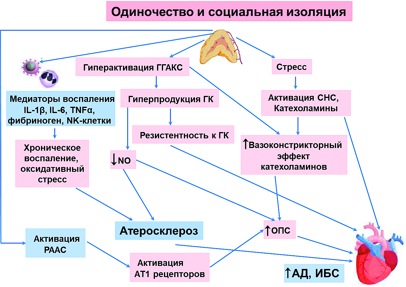 Рис. 1. Схема, иллюстрирующая связь одиночества и социальной изоляции с сердечно-сосудистыми заболеваниями. Одиночество и СИ приводят к усилению вегетативной реакции на стресс и гиперактивности симпатической нервной системы, что сопровождается повышением общего периферического сопротивления (ОПС), развитием артериальной гипертензии и ишемической болезни сердца (ИБС). СИ связана с более высоким уровнем ГК в состоянии покоя из-за чрезмерной активации ГГАКС, что приводит к резистентности к ГК и хроническому воспалению. Высокая концентрация ГК усиливает сосудосуживающее действие катехоламинов и снижает синтез NO эндотелиальными клетками. СИ активирует ренин-ангиотензин-альдостероновую систему, которая также повышает ОПС и приводит к эндотелиальной дисфункции. СИ также увеличивает число циркулирующих естественных клеток-киллеров (NK), фибриногена и других медиаторов воспаления, что ускоряет развитие атеросклероза. ГГАКС – гипоталамо-гипофизарно-адренокортикальная система, ГК – глюкокортикодные гормоны, NO – оксид азота, IL-1β – интерлейкин -1β, IL-6 – интерлейкин 6, -TNFα – фактор некроза опухоли α, СНС – симпатическая нервная система, ОПС – общее периферическое сопротивление, РААС – ренин-ангиотензин-альдостероновая система, АД – артериальное давление, ИБС – ишемическая болезнь сердца.