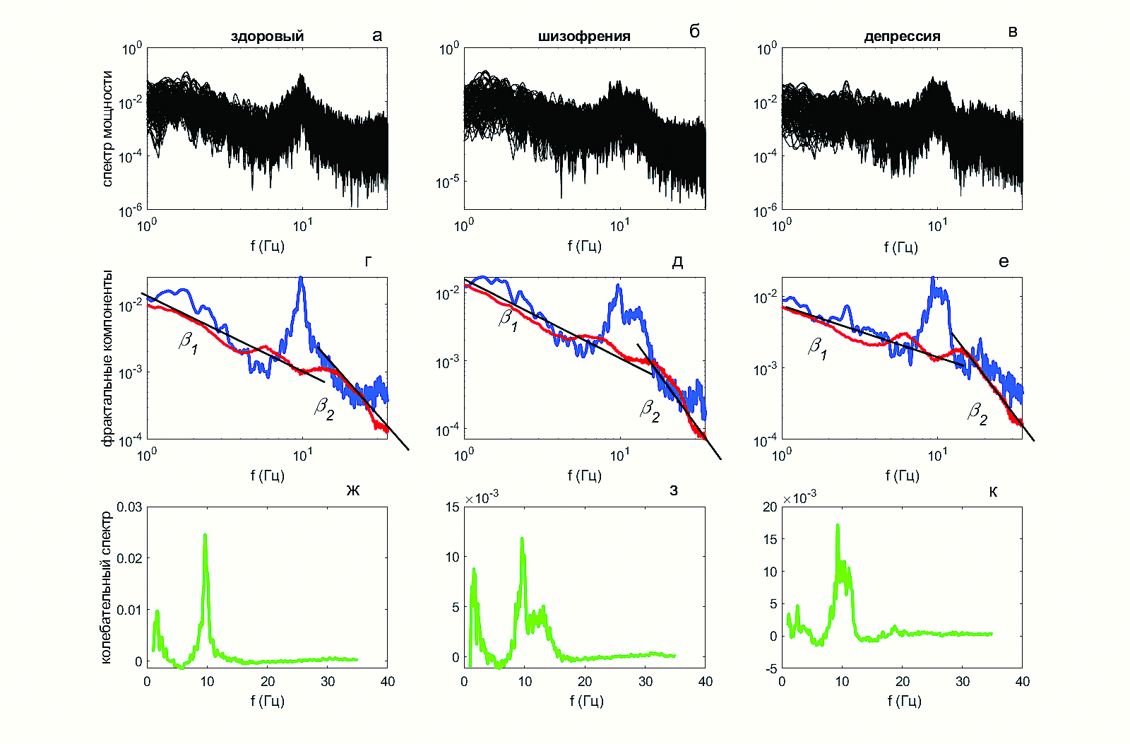 Рис. 1 иллюстрирует примеры различных компонент спектров мощности, полученных для здорового человека, больного шизофренией и депрессией с использованием метода IRASA. Исходные (смешанные) спектры мощности представлены на рис. 1а, 1б, 1в.
