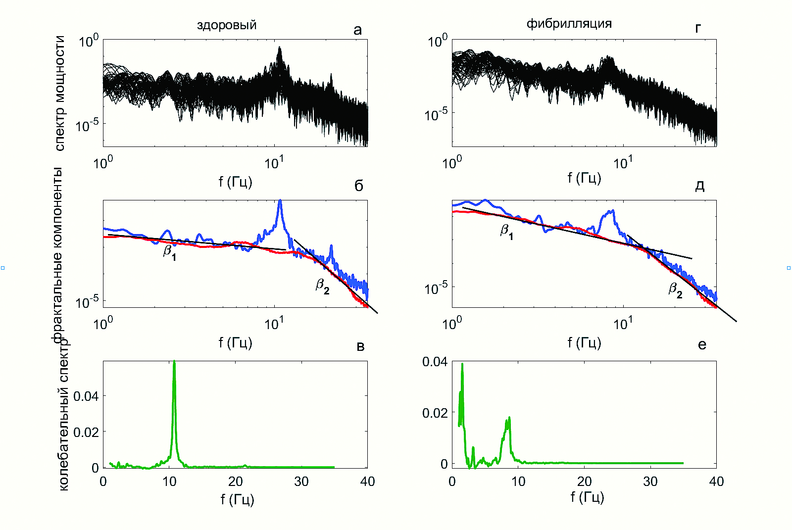 Рис. 4 иллюстрирует примеры спектров мощности, полученных для ЭЭГ здорового человека и человека с постоянной формой фибрилляции предсердий с использованием метода IRASA. Исходные (смешанные) спектры мощности показаны на рис. 4a, 4г. Усредненные смешанные и фрактальные составляющие спектров представлены на рис. 4б, 4д, при этом усредненные смешанные спектры отмечены синим цветом, а фрактальные составляющие этих спектров – красным цветом. На рис. 4в, 4е изображены усредненные колебательные спектры.