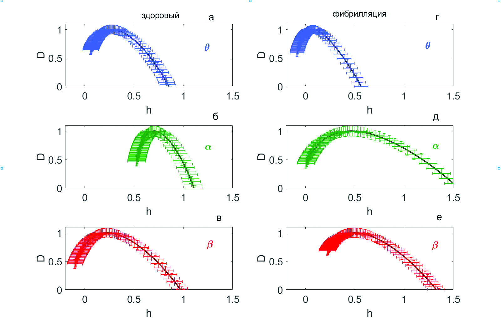 Рис. 5 показывает усредненные спектры сингулярности D(h), построенные по различным отведениям (теменным P3, P4, височным T3, T4, T5, T6, затылочным О1 и О2) для одного здорового человека (рис. 5a, 5б, 5в) и по различным отведениям одного больного с фибрилляцией предсердий (рис. 5г, 5д, 5е). Мультифрактальность паттернов ЭЭГ для всех групп испытуемых объясняется множественностью экспонент Гёльдера h, т. е. наличием спектра сингулярности. При этом для контрольной группы в паттернах ЭЭГ составляющих в тета- и в бета-диапазонах колебания являются как коррелированными, так и антикоррелированными, поскольку спектры сингулярности находятся в области значений экспонент Гёльдера 0 < h < 0.84 (рис. 5a) и в области (-0.1 < h < 0.96) (рис. 5в) соответственно. В отличие от этого, для альфа компоненты колебания характеризуются исключительно долговременными корреляциями и спектр сингулярности находится в области значений экспонент Гёльдера 0.52 < h < 1.09 (рис. 5б).