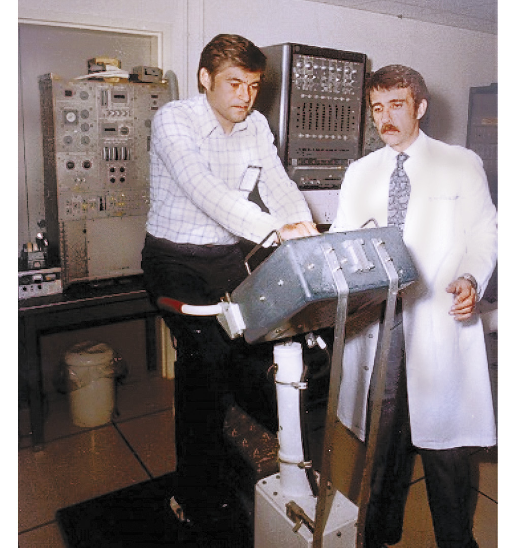 Рис. 5. В Космическом центре им. Л. Джонсона (NASA, Хьюстон, США) А.И. Григорьев испытывает с американским коллегой модель велотренажера для перспективной орбитальной станции.