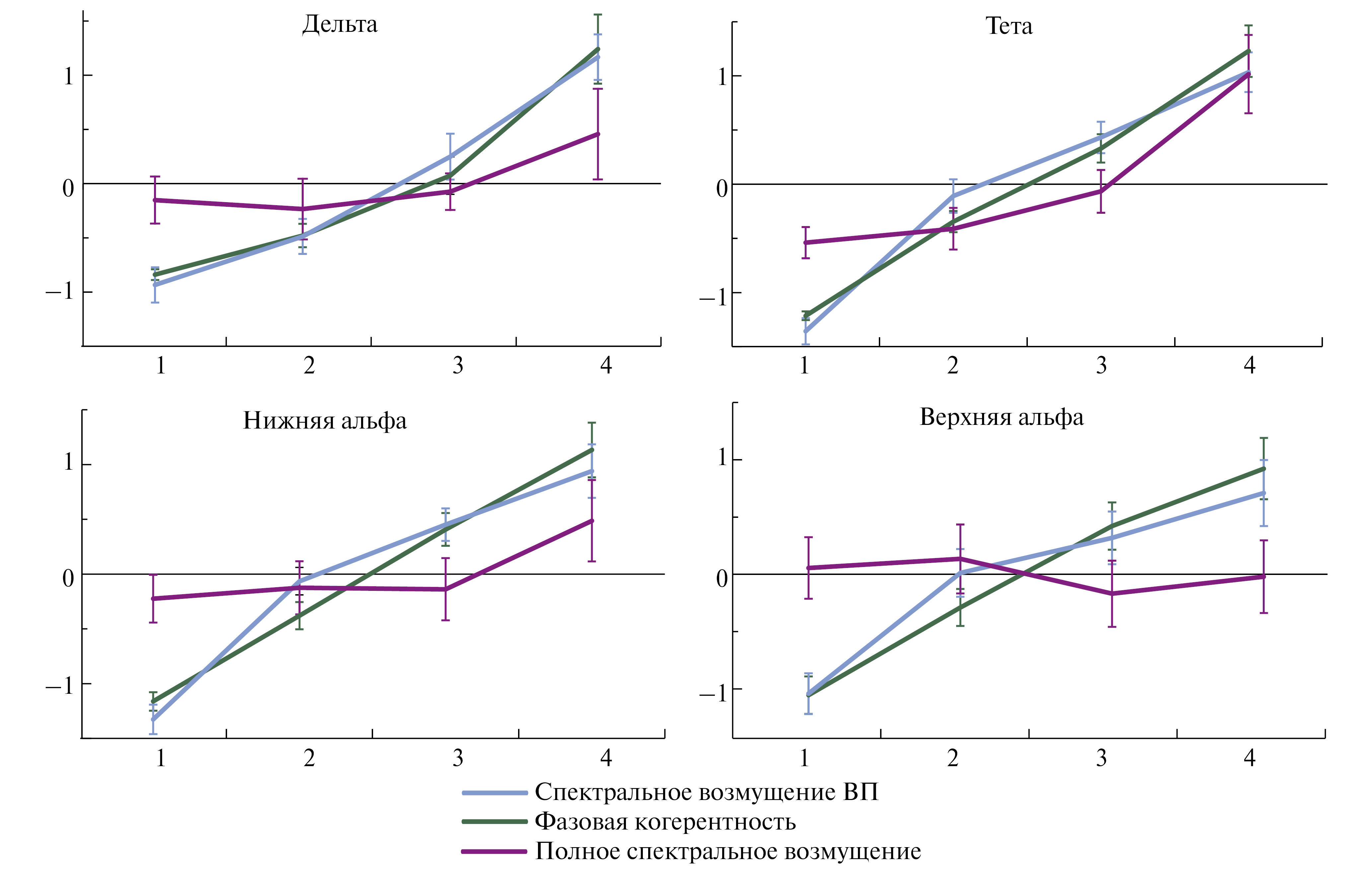 Рис. 6. Колебательные ответы на начало движения как функция скорости стимула [104] (с изменениями). Частотно-временные представления реакций усреднены в четырех диапазонах частот ЭЭГ. Для приведения спектральных величин к соизмеримым единицам измерения было выполнено z-преобразование. По оси ординат – относительные единицы. По оси абсцисс – скорость стимулов в категориальном представлении: 1 – неподвижный, 2 – медленный, 3 – быстрый, 4 – мгновенное перемещение. Вертикальные черточки показывают стандартную ошибку среднего.
