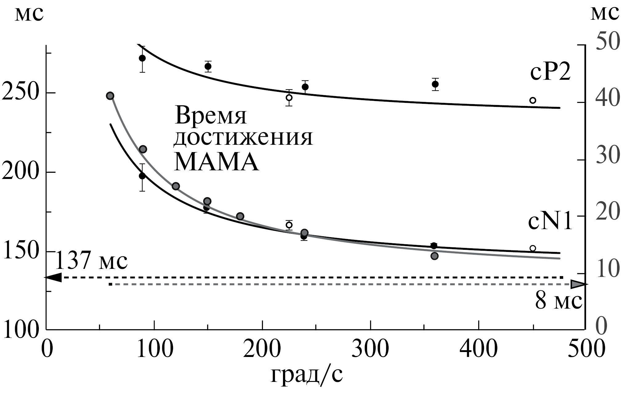 На рис. 2 приведены потенциалы MOR, полученные в нашем недавнем исследовании [104]. Широкий диапазон скоростей позволил уточнить характер зависимости амплитуды компонентов cN1 и cP2 от скорости движения. В то время как амплитуда волны cN1 увеличивалась постепенно и практически линейно, начиная с самой низкой скорости, амплитуда cP2 демонстрировала более медленный рост. В диапазоне умеренных скоростей амплитуда cP2 увеличивалась очень незначительно, и только движение со скоростью 360 град/с вызывало заметно больший ответ. Аналогичная закономерность прослеживается и для латентностей обоих компонентов.