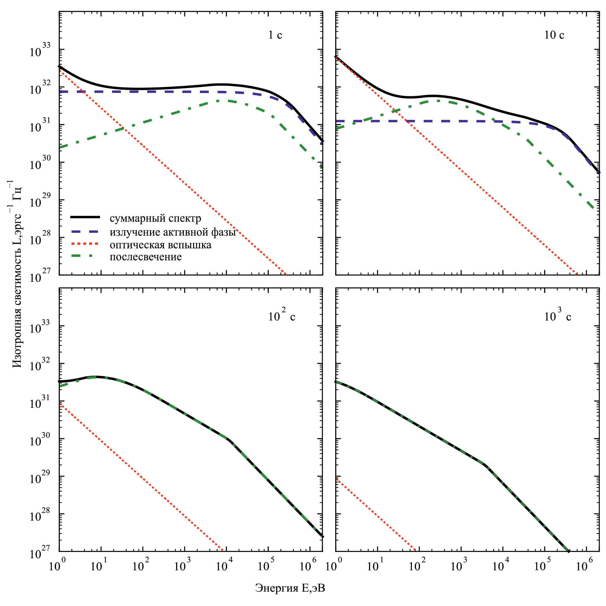 На рис. 1 показана изотропная светимость компонентов излучения гамма–всплеска (излучение активной фазы, оптическая вспышка и послесвечение) для моментов времени 1, 10, 10², 10³c после начала гамма–всплеска. Оптическая вспышка является наиболее интенсивной компонентой излучения в оптическом и УФ–диапазонах длин волн на временах t < 20 с. Светимости обратной и головной ударных волн зависят от микрофизических параметров джета. В частности, светимость L0 пропорциональна доле энергии, заключенной в магнитном поле εB (Накар, Пиран, 2005). А оценки параметра для головной ударной волны варьируются в широком диапазоне для различных гамма–всплесков, 10–8≲ εB ≲ 10–1 (Сантана и др., 2014).