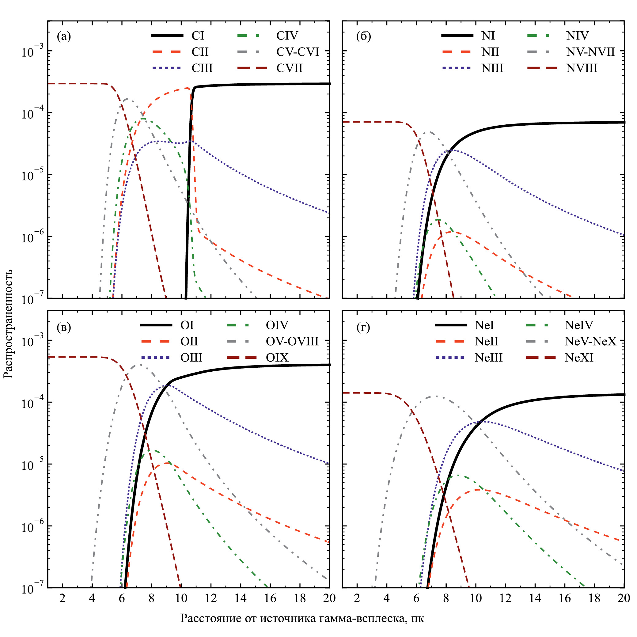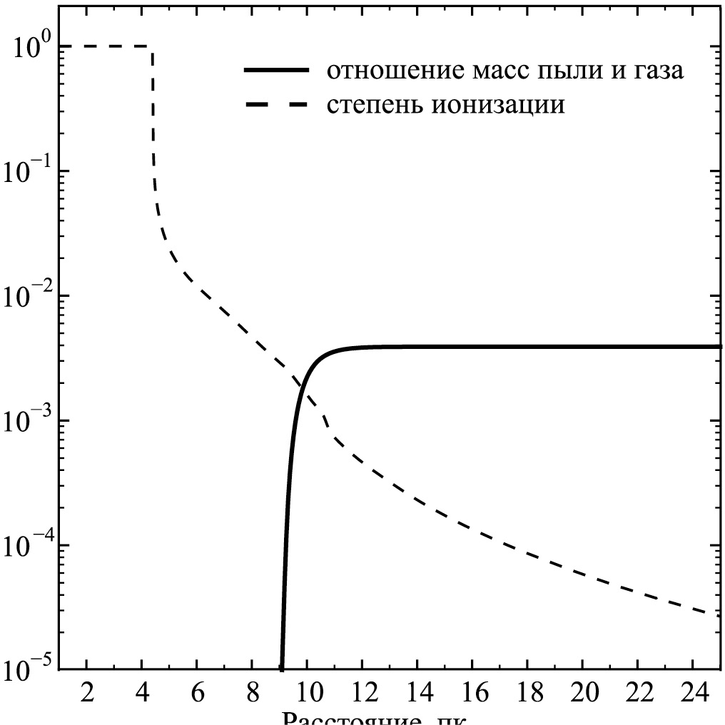 Характерное время ионизации газа излучением гамма–всплеска на расстоянии 1 пк и меньше составляет 1–3 с. Для сокращения времени счета программы численное моделирование ионизации газа производилось для расстояний R ˃ Rmin =1 пк. Облако разбивается на сферические слои одинаковой толщины ΔR. Каждый слой характеризуется внутренним радиусом Rj (расстояние от источника до внутренней границы слоя) и средним радиусом R̅j = (Rj + Rj+1)/2. Толщина слоя выбиралась равной ΔR = 5×1016 см. Для каждого радиуса R определим запаздывающее время tr = t – R/c, где t — время, прошедшее с момента испускания гамма–всплеска. Запаздывающее время tr = 0 соответствует моменту времени, когда фронт излучения гамма–всплеска доходит до слоя облака на расстоянии R.