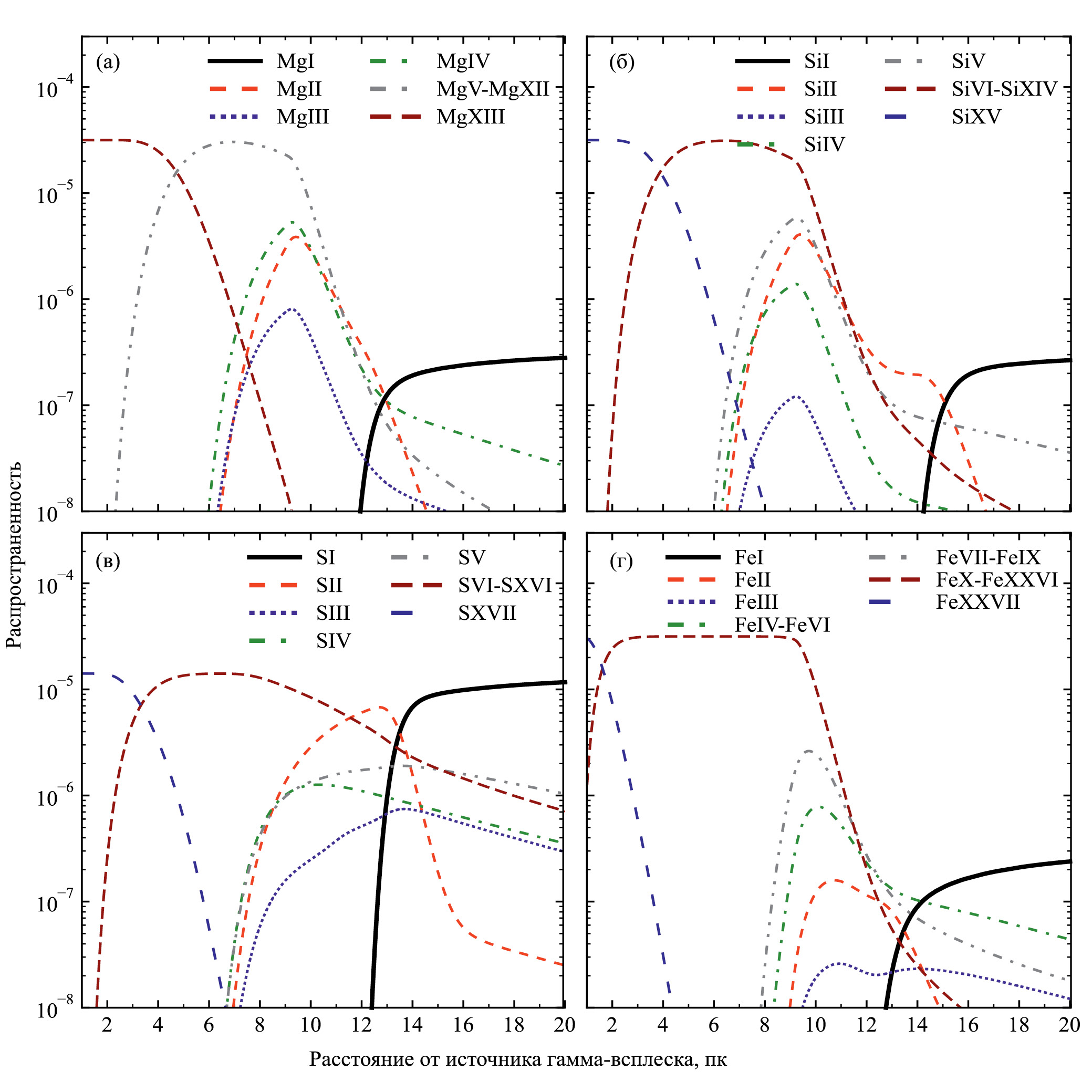 Массивные звезды имеют короткое время жизни, t ≲ 107 лет, и поэтому взрыв массивной звезды с большой долей вероятности происходит в области своего рождения (Краутер, 2012). Области звездообразования характеризуются относительно высокими плотностями межзвездного газа. Поэтому возможна ситуация, в которой излучение гамма–всплеска проходит через плотное молекулярное облако. Ряд исследований был посвящен взаимодействию интенсивного излучения гамма–всплеска с межзвездным газом вблизи источника всплеска (см., например, Дрейн, Хао, 2002; Перна, Лаззати, 2002; Перна и др., 2003; Лаззати, Перна, 2003; Барков, Бисноватый–Коган, 2005а,б; Бадьин и др., 2010). В каждой из этих работ рассматривался один из аспектов задачи. В частности, Барков, Бисноватый–Коган (2005а,б) рассматривали эффект излучения гамма–всплеска на молекулярный газ на расстоянии до 1.5 пк от источника всплеска. На таких расстояниях имеют место полная ионизация газа рентгеновским и гамма–излучением и нагрев до высоких температур, Tg ≳ 104. К. В нашей работе исследуется эффект излучения гамма–всплеска на молекулярный газ на бо́льших расстояниях от источника всплеска — несколько парсек и больше. Численный метод, который используется в нашей работе, аналогичен подходу Дрейна, Хао (2002). Дрейн, Хао (2002) в своей модели рассматривали УФ–излучение гамма–всплеска (“быстрое” оптическое излучение), при этом ионизация ионов металлов не рассматривалась в их модели. В нашей модели учитываются УФ– и рентгеновское излучения гамма–всплеска, и показано, что ионизация ионов металлов должна учитываться для определения ионизационной структуры облака. Цель данной работы — определить компоненты газа (H₂, Не, ионы металлов, пыль), которые вносят основной вклад в поглощение излучения послесвечения гамма–всплеска в оптическом и рентгеновском диапазонах длин волн.