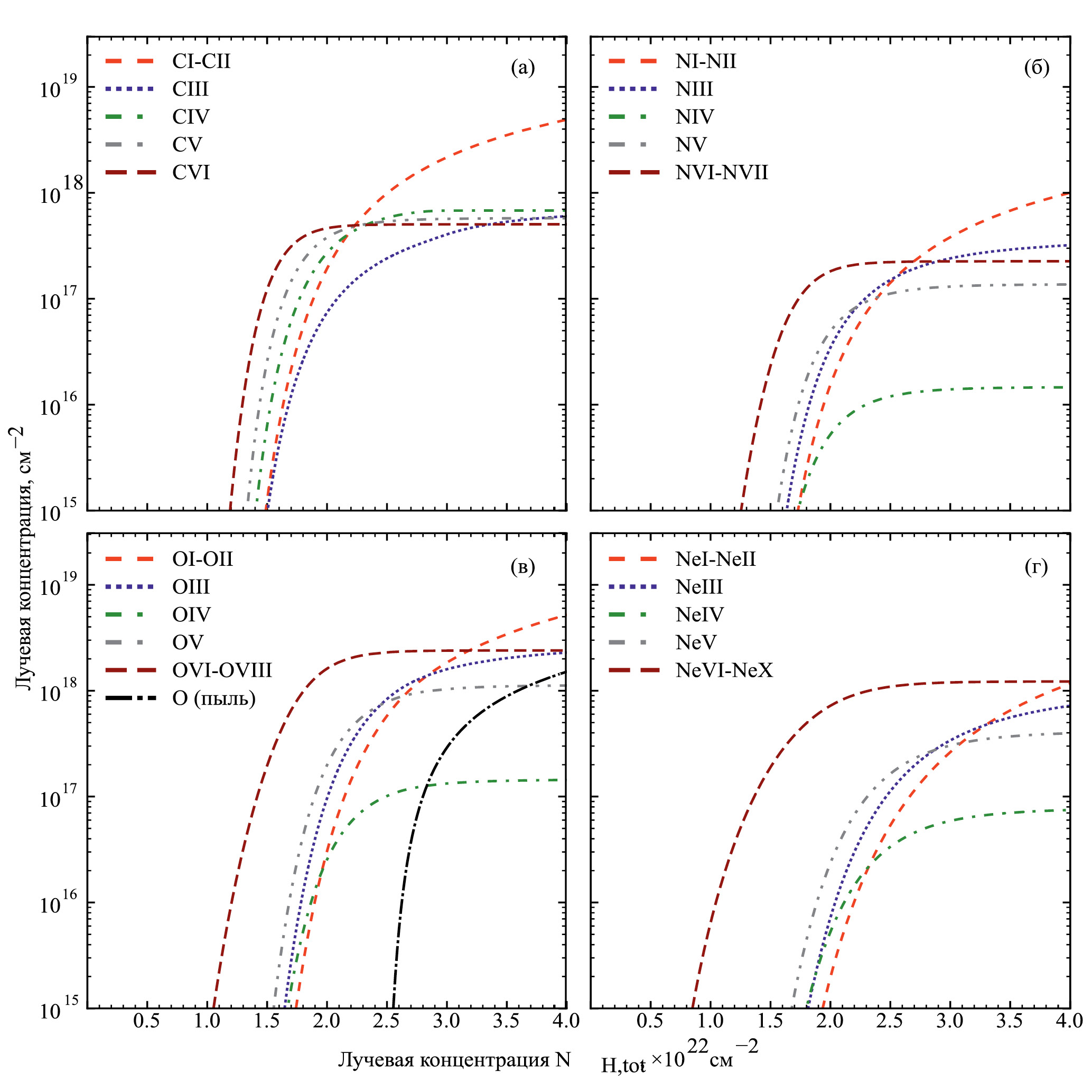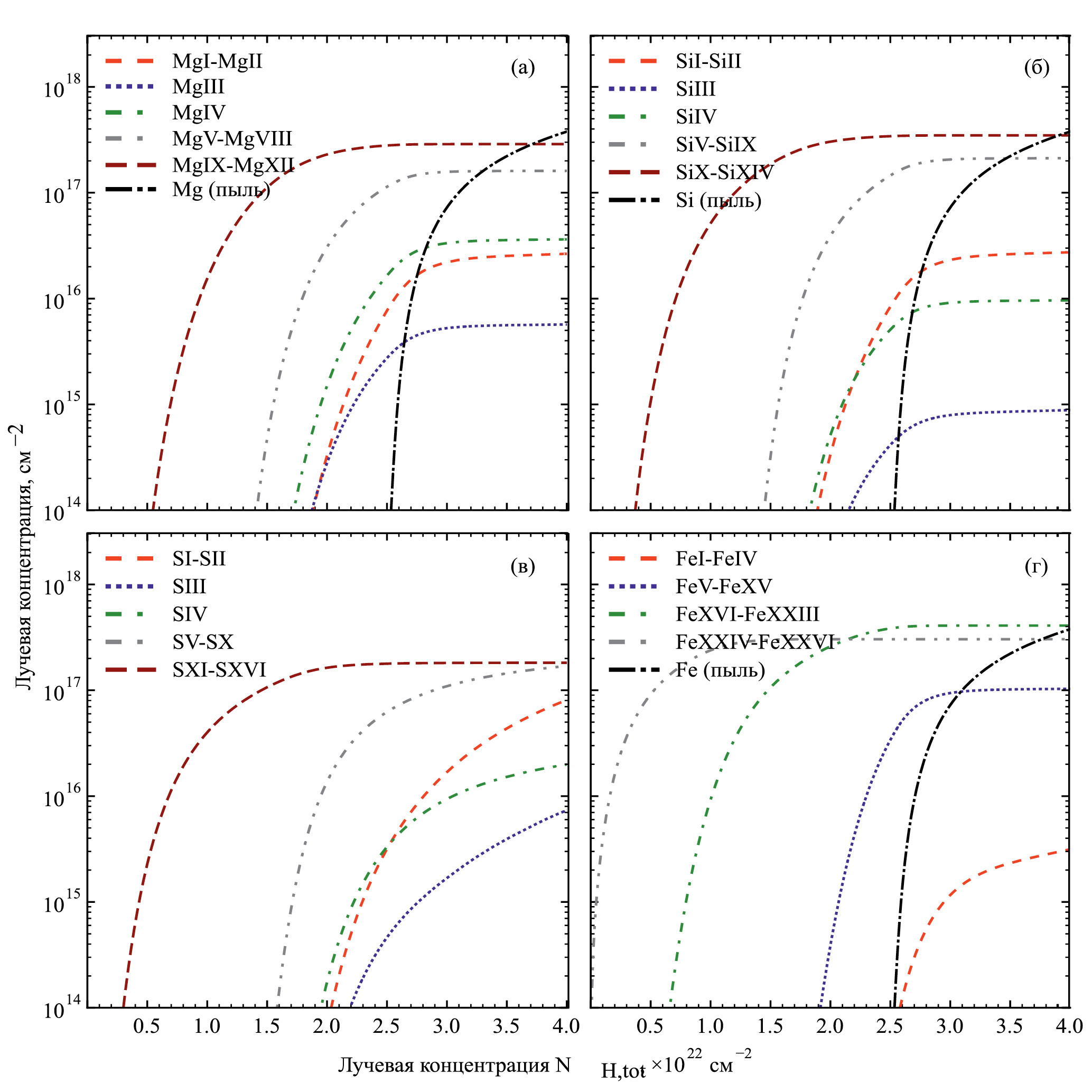 По поглощению послесвечения гамма–всплеска в рентгеновской части спектра можно оценить лучевую концентрацию водорода NHX. Причем в этих оценках обычно предполагается, что излучение поглощается ионами металлов. Было обнаружено, что лучевые концентрации NHX, как правило, на порядок и более превышают лучевые концентрации водорода NH, вычисленные по данным в оптическом диапазоне длин волн — по линиям атомарного водорода, линиям ионов металлов, или AV (Уотсон и др., 2007; Кампана и др., 2010, 2012). Одно из решений несоответствия наблюдаемых значений лучевых концентраций водорода заключается в том, что излучение в рентгеновском диапазоне длин волн поглощается в слое ионизованного газа вблизи источника гамма–всплеска (Шади и др., 2011; Кронгольд, Прочаска, 2013). Ионы металлов, которые имеют большой заряд, вносят вклад в величину поглощения послесвечения в рентгеновской части спектра, однако не видны в оптическом и ультрафиолетовом (УФ) диапазонах длин волн. Это объяснение подтверждается тем, что анализ переменности профилей абсорбционных линий ионов металлов с малым зарядом в послесвечении гамма–всплесков указывает на то, что облака нейтрального газа находятся на расстоянии ∼100–1000100–100 пк от источника всплеска (например, Вресвийк и др., 2007). Были предложены другие объяснения наблюдаемого поглощения излучения послесвечения в рентгеновском диапазоне — поглощение ионами He в HII области, где произошел гамма–всплеск (Уотсон и др., 2013). Диффузная межгалактическая среда и абсорбционные системы на луче зрения вносят существенный вклад в поглощение излучения для гамма–всплесков на красных смещениях z ⩾ 3 (Сталинг и др., 2013; Рахин, Бехар, 2019).