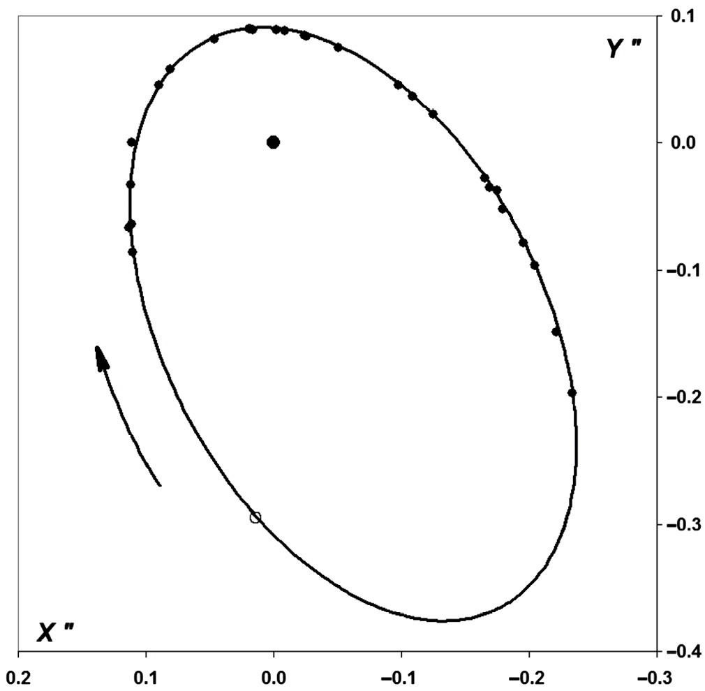 Рис. 3. Орбита спутника ADS 15571 Ab относительно главной звезды Aa. Маленькие черные кружки — наблюдательные точки. Открытый кружок — предполагаемое положение спутника в 2010 г. по наблюдениям, приведенным в работе (Хорч и др., 2011).