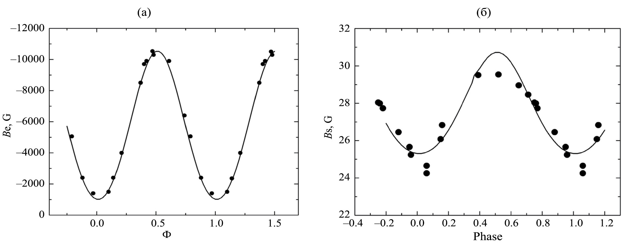 В первую очередь нас интересуют структуры магнитного поля и его параметры. К настоящему времени получены модели и их параметры для около 140 магнитных звезд (Глаголевский, 2019). Поэтому опыт в этом отношении накоплен достаточный. Для построения модели магнитного поля используются зависимости изменения продольной компоненты магнитного поля Bₑ(Ф) или среднего поверхностного поля Bs(Ф) от фазы периода вращения по методике, разработанной Гертом и Глаголевским (2003), в которой предполагается, что структуры магнитного поля СР-звезд соответствуют теоретическому магнитному диполю. Бэбкок уже в самом начале своих фундаментальных работ пришел к выводу, что структура магнитного поля магнитных звезд близка к структуре теоретического магнитного диполя. Эта гипотеза до сих пор поддерживается всеми современными исследованиями, в частности, в работе (Матисс, 1997), а также в Глаголевский (2017). Необходимый для моделирования угол наклона звезды к лучу зрения i определяется, как правило, с помощью vsini. В тех случаях, если имеются обе фазовые зависимости, угол получается автоматически из двух моделей. Такой способ уже успешно применялся нами уже для целого ряда объектов (Глаголевский, Назаренко, 2015, 2017; Глаголевский, 2012, 2013), и он одновременно служит подтверждением правильности предположения о дипольной структуре магнитных полей СР-звезд и правильности оценок магнитного поля. Надо иметь в виду, что величины Bₑ и Bs определяются разными способами.