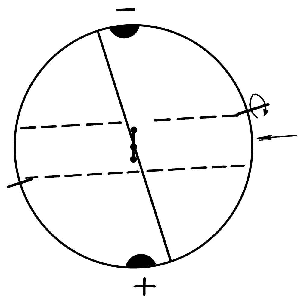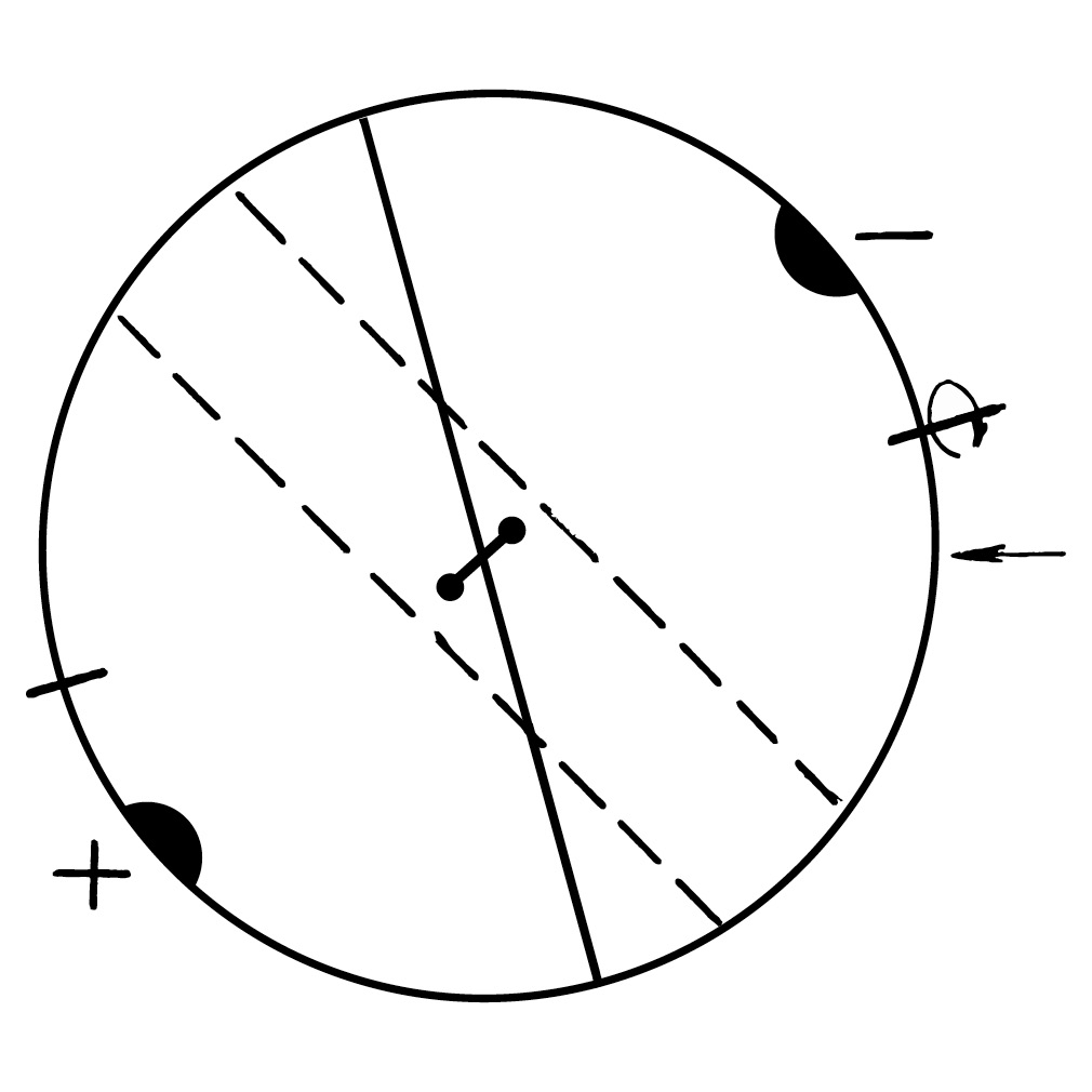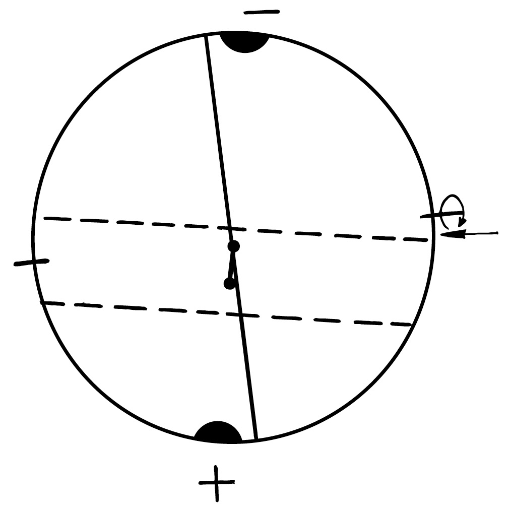 Этот угол нетипичный для магнитных звезд (рис. 3). При такой ориентации диполя магнитная протозвезда не могла потерять момент вращения с участием магнитного поля. Очевидно, что малый момент вращения достался от родительской протозвезды. Среднее модельное поверхностное поле Bs = 9352 Гc, поле на магнитных полюсах равно Bp = ±12 645 Гc. Малый угол i = 15° приводит к тому, что наблюдатель видит преимущественно область с магнитным полем положительной полярности. Схема звезды показана на рис. 7, откуда видно, что при вращении звезда постоянно направлена к наблюдателю областью с положительным магнитным полем. Благодаря более удобной для измерений магнитного поля ориентации диполя разброс точек на фазовой кривой незначителен.