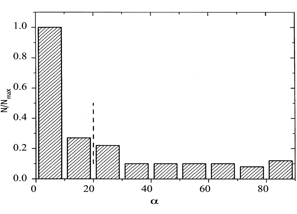 Рис. 3. Распределение величин N/Nmax магнитных звезд по углу α.