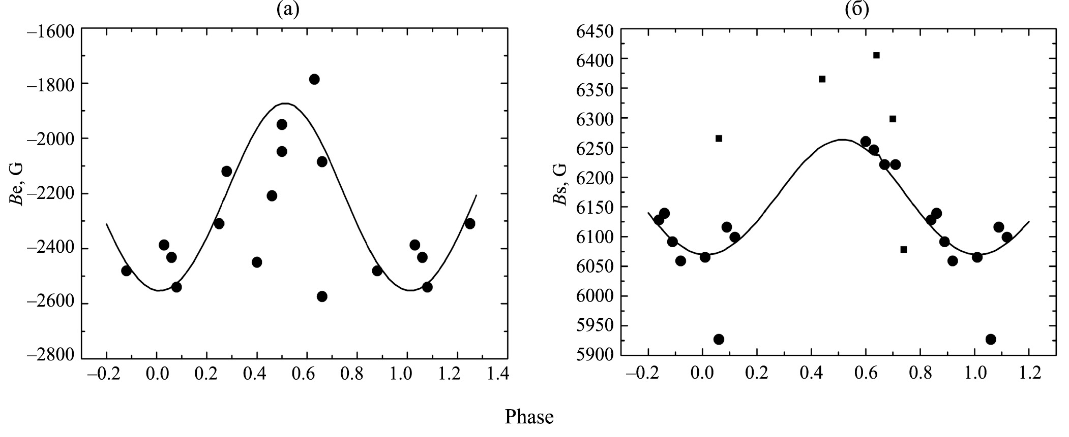 Учитывая утверждение, сделанное в предыдущем параграфе, что модель по водородным измерениям Bₑ предпочтительнее, делаем вывод, что иногда результаты моделирования по Bₑ(Ф) и по Bs(Ф) совпадают, в зависимости от условий ориентации звезды. Для сравнения приводим данные из (Ландстрит, Матисс, 2000), где α = 5° и i = 47°. Видно значительное различие в величине угла i, которое происходит в результате, скорее всего, неправильной величины vsini у этих авторов. Амплитуда Bs приводится в этой работе как 6050–6400 Гc, наш результат 6275–6075 Гc, примерно такой же. Следует сделать следующее замечание: первые по времени четыре измерения не укладываются в фазовую зависимость, демонстрируя большой разброс величин Bs, хотя по времени они занимают около 40% полного цикла наблюдений. Эти данные отмечены квадратиками на рис. 4б. Наша модель учитывает остальные 13 измерений.