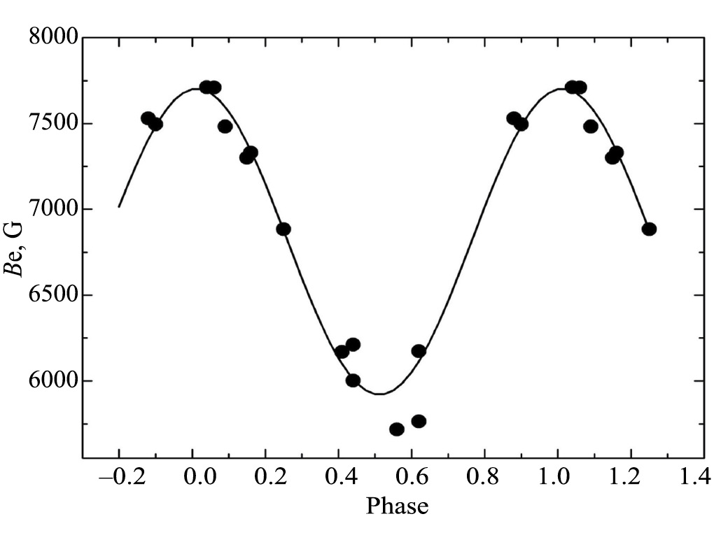 Период вращения определен в работе (Хубриг и др., 2014) как P = 5.367d. В случае этой звезды известна только фазовая зависимость Bₑ(Ф), поэтому для построения модели необходимо определить угол наклона i из vsini. В указанной работе найдена очень малая величина vsini = 3.5 ± 0.5 км/с, которая близка 4 км/с, полученной в (Елькин и др., 2008). По формуле v = 50.6 R / P = 14.6 км/с, с учетом vsini = 3.75 км/с находим i = 15°. На рис. 6 точками показана измеренная по линиям водорода фазовая зависимость, построенная по данным (Хубриг и др., 2014), а также модельная кривая. Она соответствует центральному диполю с углом α = 65° (табл. 6).