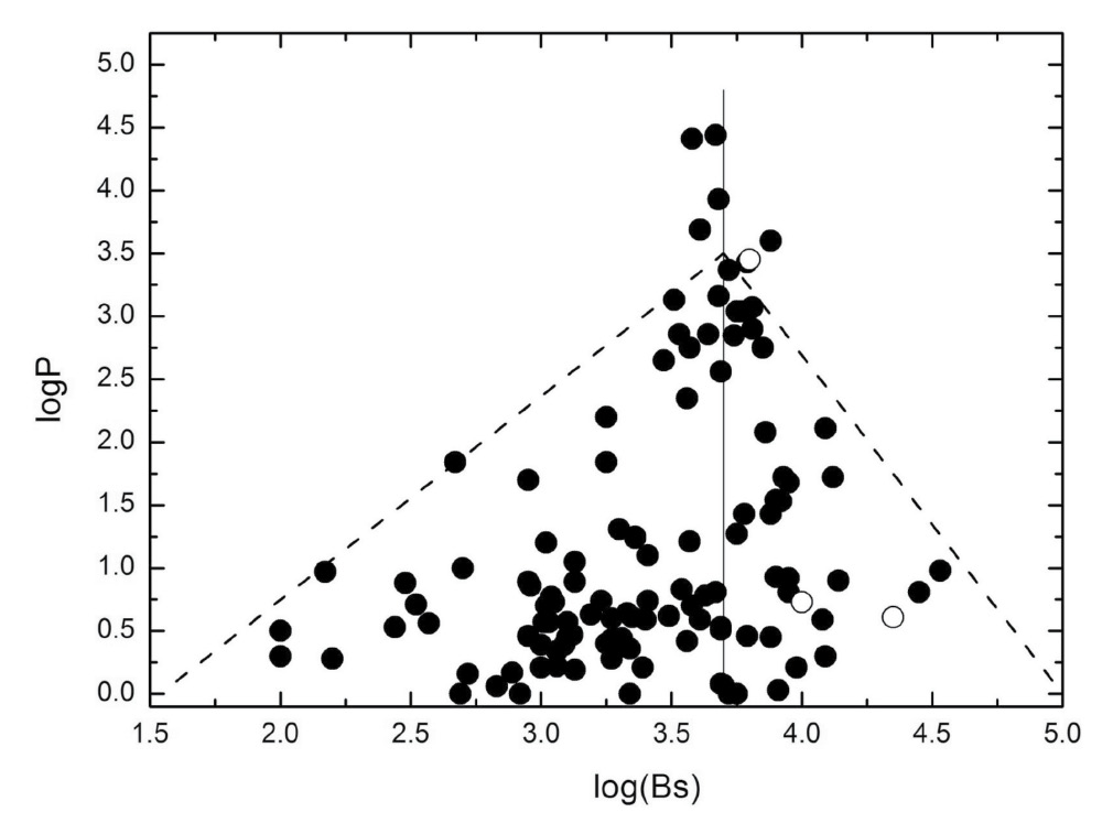 Рис. 8. Зависимость периода вращения магнитных звезд звезды от величины магнитного поля. Белые кружки — изучаемые объекты.