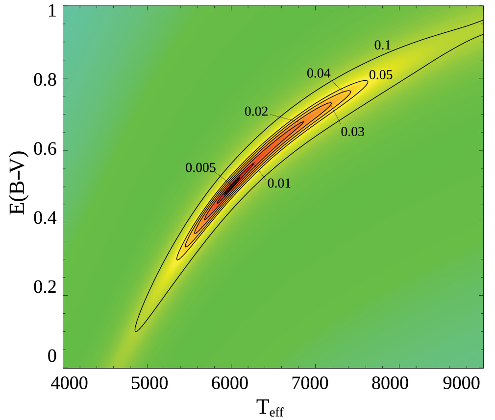 Большую проблему представляет одновременная оценка параметров звезд (Teff, log g, [Fe/H]) и межзвездного покраснения E(B–V) (или поглощения AV в фильтре V) фотометрическими методами. Чтобы облегчить задачу, приходится привлекать дополнительную информацию. Беликов, Росер (2008) применили метод интервально-кластерного анализа для определения астрофизических параметров звезд по данным широкополосной фотометрии даже при наличии межзвездного покраснения, благодаря использованию свободных от покраснения Q-индексов. Среди множества формальных решений по соответствующим критериям выбирается наиболее вероятное. Монгуио и др. (2014) использовали индексы фотометрии Стрёмгрена, менее чувствительные к покраснению, и эволюционные треки звезд. Сан и др. (2023) разработали алгоритм для поиска Teff, [Fe/H], абсолютной звездной величины в G-фильтре Gaia MG и покраснения E(GBP – GRP) отдельных звезд с использованием эмпирической звездной библиотеки, которая сопоставляет звездные параметры с многополосной фотометрией и параллаксом, а также привлекает параметры атмосфер из проекта LAMOST. Лоренцо-Гутиеррез и др. (2020) разработали метод минимизации χ2 (подход Монте-Карло) в рамках сетки моделируемых цветов проекта GALANTE (семь узко- и среднеполосных фильтров в диапазоне длин волн 3000–9000 Å, предназначенных специально для извлечения максимума информации о физических свойствах звезд). Здесь авторы не используют априорную информацию.