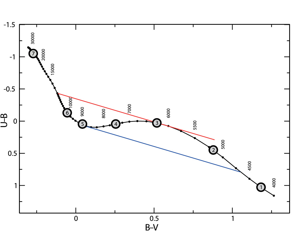 Для проверки внутренней точности метода мы вычисляли синтетические цвета по заранее заданным параметрам, как описано в подразделе 1.2, и запускали алгоритм минимизации. Было создано 56 наборов параметров (Teff, E(B–V), log g, [Fe/H]). Значения эффективных температур приведены в табл. 2 и показаны на двухцветной диаграмме (B–V) – (U–B) (рис. 2), построенной для звезд-карликов солнечной металличности. Точки из логарифмической шкалы температур были выбраны следующим образом. Покрасневшие звезды на диаграмме переходят от нормальных цветов вправо по линии покраснения. Существует большая область, где покрасневшие звезды могут пересекать диаграмму более одного раза из-за ее немонотонного поведения. Эта область ограничена верхней и нижней линиями покраснения, касающимися точек изгиба. Они разбивают диаграмму на пять частей, в центре которых были выбраны значения эффективной температуры (NN1,2,4,6,7). Также мы добавили две точки изгиба (NN3,5). Поведение результатов испытаний между точками 6 и 7 аналогично, несмотря на значительную разницу температур. Для каждого значения Teff мы рассмотрели варианты звезд-карликов (log g = 4.5) и гигантов (log g = 2.0), с солнечной металличностью ([Fe/H] = 0) и случаи звезд с низким содержанием металлов ([Fe/H] = –2.0), с покраснением и без него (E(B–V) = 0.5 и E(B–V) = 0). Всего 56 наборов параметров, восемь вариантов для каждой из семи эффективных температур.